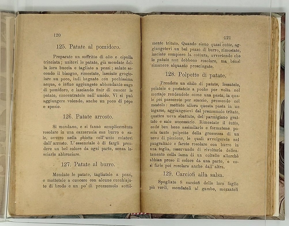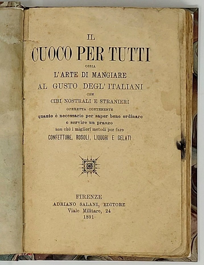 >in-8 (mm 160x105), pp. 256. Legatura moderna in cartone, brossura originale figurata conservata con strappi e abrasioni. Edizione originale, non comune, di ricettario popolare, che presenta oltre trecento ricette della cucina tradizionale italiana, "nonché i migliori metodi per fare confetture, rosoli, liquori e gelati". Esemplare uniformemente brunito con piccola macchia d'inchiostro al margine esterno delle prime carte. Benporat, Ricettari italiani dell'800, “Appunti di Gastronomia”, 17 (1995), p. 61.