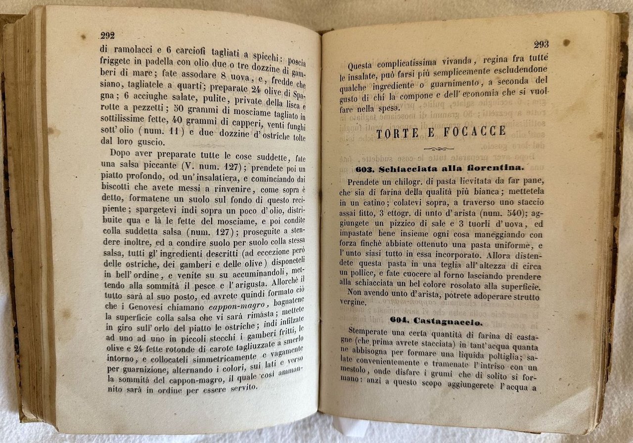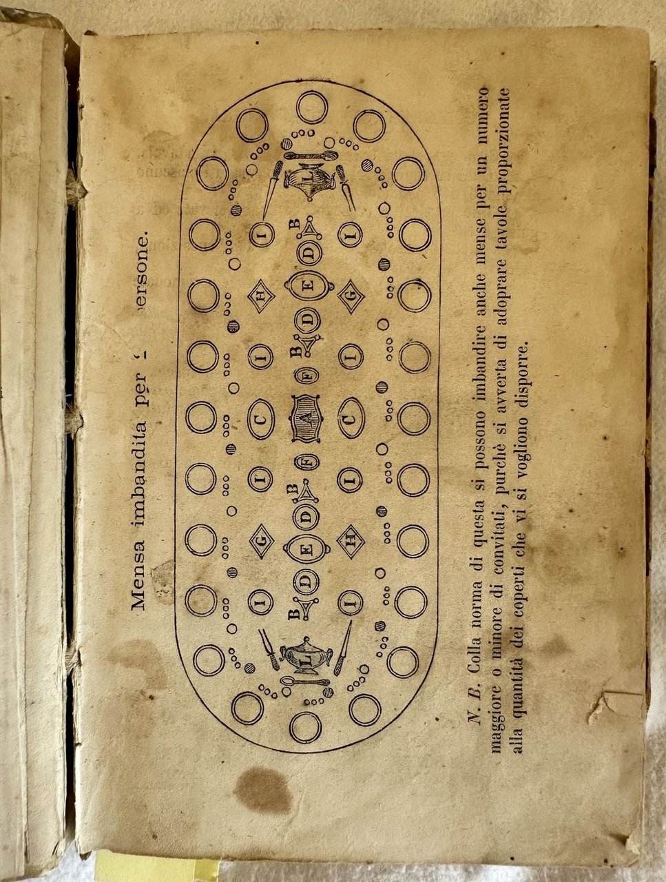 Raro volume di cucina del 1871, una raccolta di ricette tipiche italiane ed estere. All'inizio incisione con la disposizione dei piatti in tavola e istruzioni generali con regole di galateo e di cucina come il taglio della carne, la panificazione, conservazione delle sostanze alimentari ecc. Seguono ricette di confetture (sia dolci che salate) e pietanze varie. In buone condizioni. Copertina in mezza pergamena muta in discrete condizioni con usure marginali. Angolo inferiore del piatto posteriore è assente. Legatura in buone condizioni. Pagine in buone condizioni con fioriture. Rinforzo al margine destro di pag. 96. Ultima pagina di indice staccata ma presente. Occhietto mancante. Bruniture. In 16. cm. 16x11,5. Pp. 383. Scarce volume of recipes of 1871, a collection of typical italian recipes. At the beginning engraving with a lunch table and general instructions of good manners, disposizion of dishes, cutting of meat, preparation of bread, conservation of food ecc. Then recipes of sweet and salad jams and different recipes. In good conditions. Half parchment cover in fair conditions lightly worn in the extremities. Lower corner of back plate lacks. Binding in good conditions. Pages in good conditions with foxing. Reinforcemnt in the right edge of pag. 96. Last page of index detached but present. False title page lacks. Occhietto mancante. In 16. cm. 16x11,5. Pp. 383. <BR><BR>