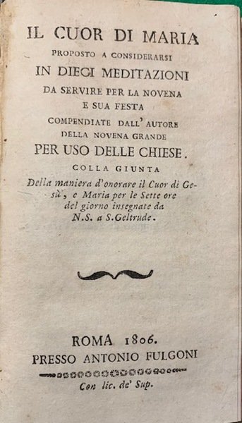 Il Cuor di Maria proposto a considerarsi in dieci meditazioni da servire per la novena a sua festa compendiate dall'autore della novena grande per uso delle chiese colla giunta della maniera d'onorare il Cuor di Gesù, e Maria per le sette ore del