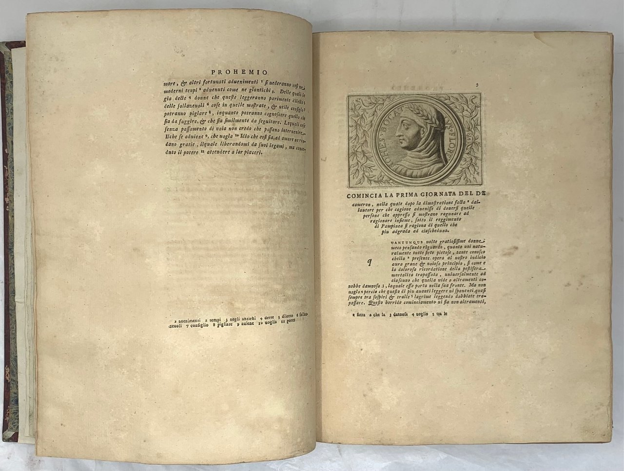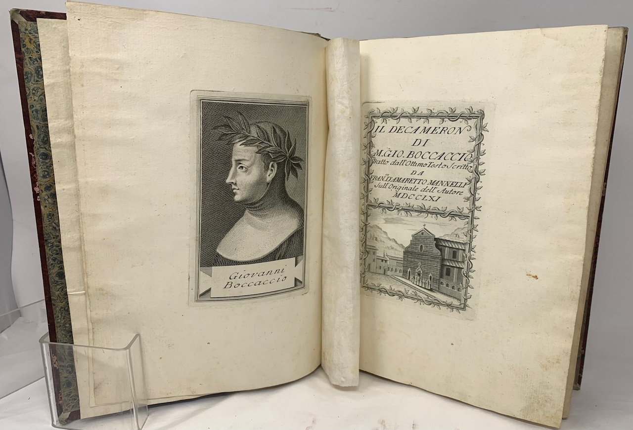 >in-4, pp. XXXVI, ff. 373, leg. ottoc. m. perg., tit. oro al dorso. Con impresa tip. del giglio Giuntino in silogr. in fine alle pp. prelim. ed in fine al vol.; testo in minuto, ma nitido car. corsivo. E' corredato di tit.-front. inc., ritratti di Boccaccio e di Mannelli, un albero genealogico di quest'ultimo a stampa ripieg., una tav. inc. col facsimile del Ms. ed una vignetta col busto del poeta all'inizio del testo. Edizione molto stimata, pubblicata da Pier Ant. Guadagni e Ang. Maria Bandini, citata dagli Accademici della Crusca e lodata anche dal Foscolo; essa trascrive il celebre codice Mannelli (il quale lo aveva steso nel 1384, nove anni dopo la morte del poeta, suo amico) e si basa anche sull'ediz. ''Ventisettana'', le cui varianti sono riportate a pié di pagina, e su quella del 1573. Esempl. su carta grande (con lieve uniforme brunitura della carta a metà del vol., come in tutti gli esempl.). Bacchi della Lega, Bibliogr. Boccaccesca, pp. 51-2: «Questa celebre edizione...si raccomanda per la legittimità del testo». «Gamba 187: «stimatissima edizione». Razzolini p. 64. Bacchi della Lega