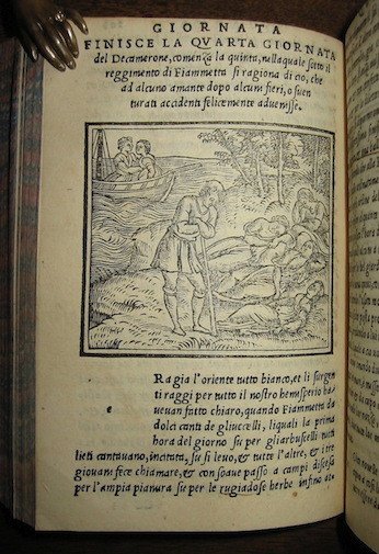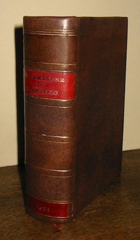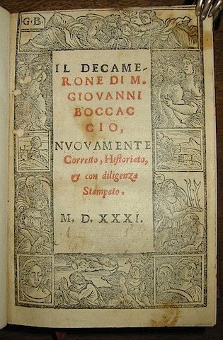 8vo (cm. 13,8), 439 cc., 9 cc.nn. Frontespizio figurato stampato in rosso e nero e 10 xilografie, una diversa dall’altra, all’inizio di ciascuna giornata. Nuova legatura in vitellino marrone con fili, titolo e data in oro su doppio tassello in pelle rossa al dorso. Tagli colorati a pettine come le carte di guardia. Un timbretto sulla carta di guardia libera anteriore. Al verso bianco dell’ultima carta un’antica curiosa scritta ‘La Seignora mia donzella.’. Qualche antica sottolineatura ed annotazione marginale. Esemplare con margini superiori molto corti o talora assenti (con perdita della intitolazione, della numerazione e, in poche carte, della parte superiore della riga iniziale). L’opera è tuttavia leggibile, completa e, per il resto, salvo due o tre piccole macchie, in ottimo stato di conservazione. Si tratta di un’edizione assai curata a cominciare dalla ricca cornice del frontespizio, al cui interno convivono immagini di amorini, baccanti, satiri ecc., che appare molto integrata con il mondo boccaccesco, per continuare poi con le vignette, tutte espressione di un gusto, raffinato e popolaresco al tempo stesso. Con questa edizione, inoltre, ha inizio la scelta, che si rivelerà avere grande seguito nelle edizioni successive, tanto da divenire una vera tradizione, di illustrare una giornata alla volta con apposite vignette. Di estrema rarità. Nel Catalogo ICCU un esemplare in una sola biblioteca italiana. Br. Libr., p. 110. Non in Adams.