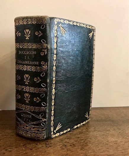 16mo (cm. 11,8), 932 pp. (frontespizio supplito in riproduzione), 2 cc.nn. (di 14). Ritratto del Boccaccio entro ovale a p. 16 e dieci deliziose vignette xilografiche poste all’inizio di ciascuna Giornata. Testatine iniziali figurate. Elegante legatura del ‘700 in marocchino verde a grana lunga. Titoli e ricchi fregi in oro al ds. Cornici con fleurons angolari ai piatti. Tagli rossi. Alcune carte rimontate e qualche lieve altro difetto ma, nel complesso, esemplare (pur con le mancanze segnalate) in più che buono stato di conservazione. Rara prima edizione francese del Decameron in lingua italiana. Brunet (I, 101): ‘Les exemplaires en sont fort recherchés, mais on les trouve difficilement en bon état’.