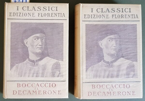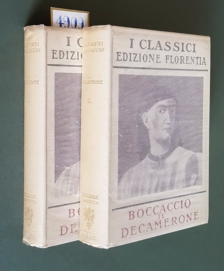 N. 2 volumi in -16 (11 x 16 cm.), legatura editoriale t.tela col. avorio con scritte e fregi in oro incisi sul piatto e al dorso, piatti della sopracopertina preservati sotto la velina trasparente di protezione, pp. 455, 538, (6), 2 ritratti del Boccaccio in antiporta di ciascun volume. In buone condizione.