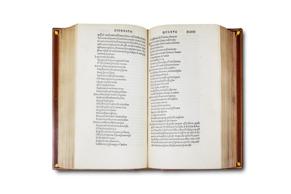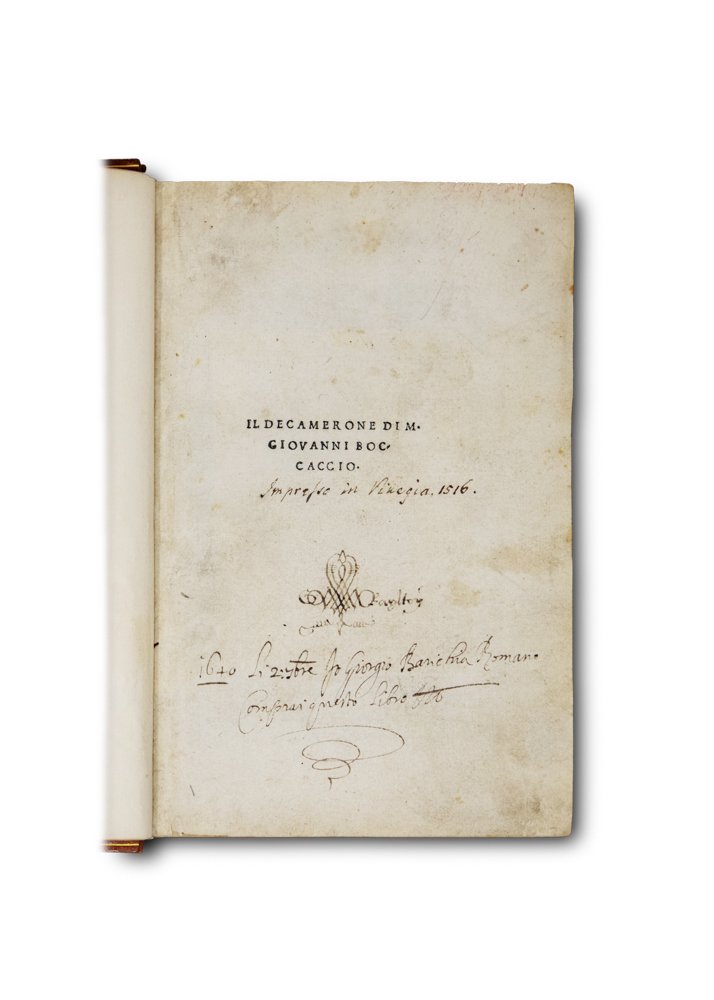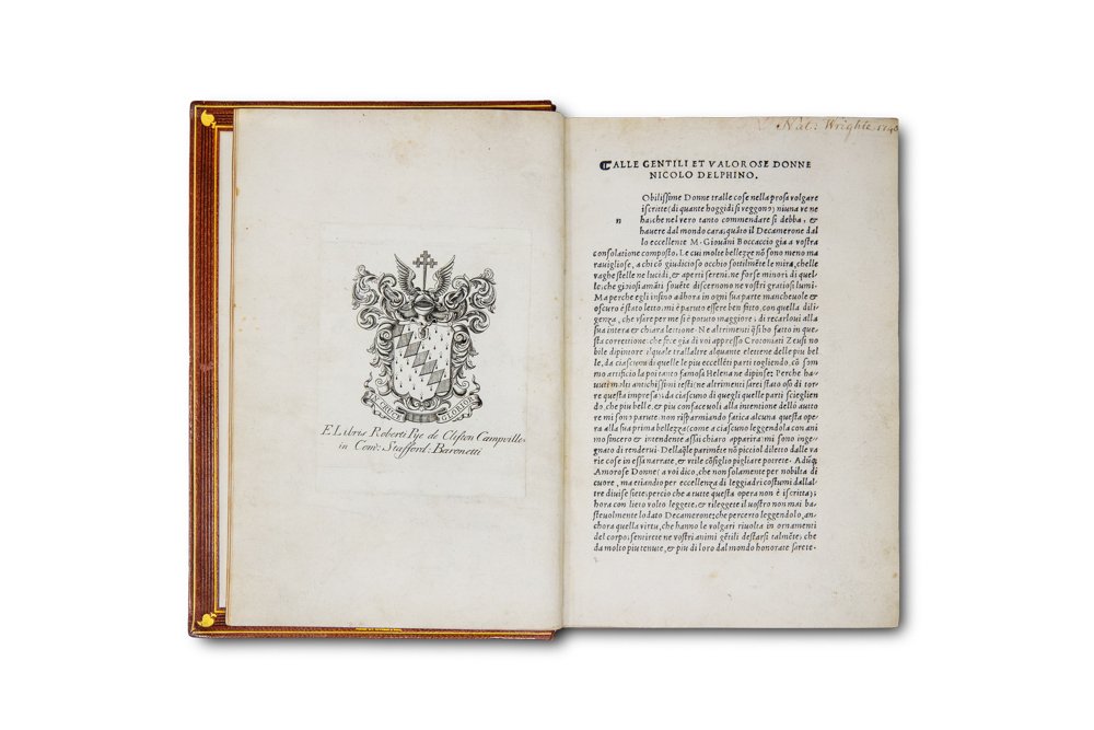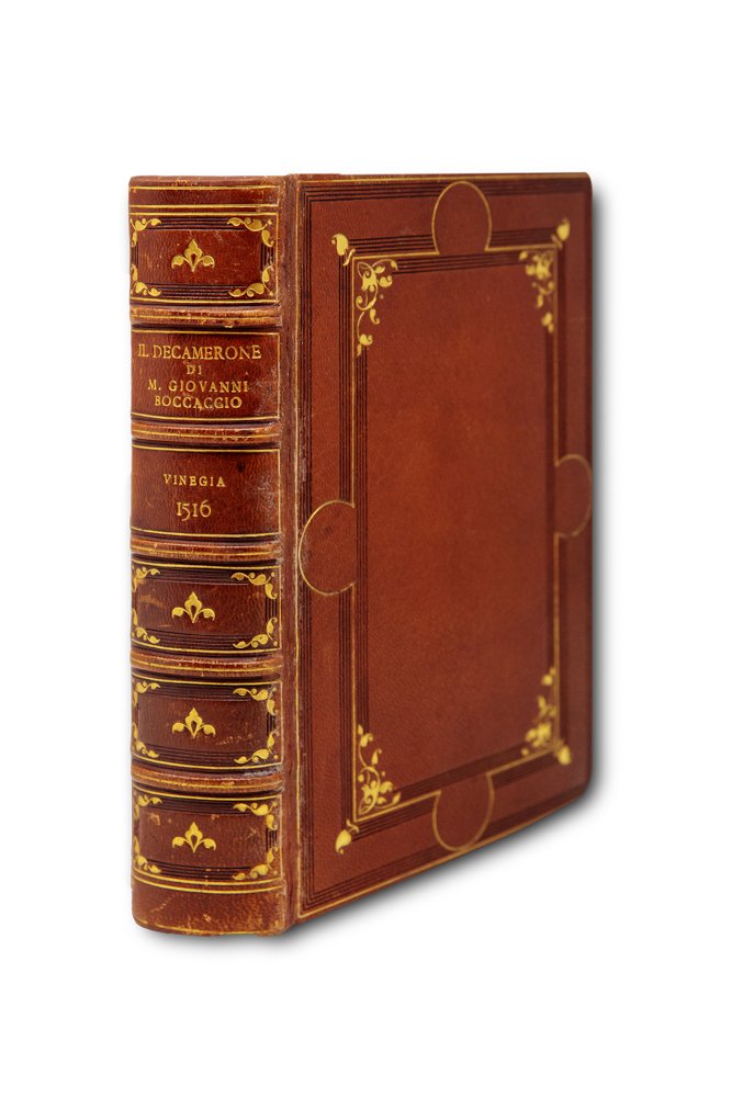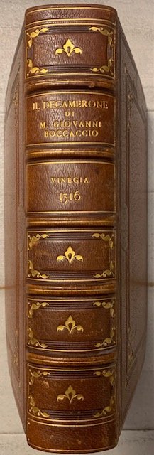 >in-4 (mm 206x135), ff. (2), CCCLII, (10, ultimo bianco), raffinata e perfetta legatura d'amatore in marocchino nocciola, dorso a 5 nervi con filetti a secco e ricchi fregi in oro, titolo e note su due scomparti; i piatti con elaborata bordura in oro e a secco con volute e terminazioni angolari a racemi (firmata al contropiatto Riviere & Co.). Precede il testo l'inusuale dedica del Delfino "Alle gentil et valorose donne"; in fine Errata e Tavola dell'opera. Prima edizione in formato in-4 e prima a cura del Delfino, che ebbe il merito di riordinare e presentare l'opera boccaccesca nella sua integrità: "ebbe veramente il merito di fare i primi passi per ridonare al Decamerone la sua integrità; per lo che questa edizion salì in molta fama" (Gamba 169). Edizione assai stimata dal punto di vista filologico, è ricercata anche per la sua rarità (censita in sole 10 Biblioteche pubbliche italiane); "...oggi di una sicura rarità. E' la prima edizione che uscisse nel formato di quarto, e la prima in cui si cercasse di ridurre il Decameron alla sua integrità" (cfr. Bacchi della Lega, 34). Edizione preziosissima dal punto di vista filologico, oltre che tipografico. Costituì un notevole balzo in avanti nella qualità testuale, fu curata nel 1516 da Niccolò Delfino , che collazionò il testo dell'edizione mantovana del 1472, che a sua volta si rifaceva sostanzialmente alla princeps, con alcuni manoscritti quattrocenteschi; l'editore infatti "sosteneva di aver restaurato l'opera 'alla sua intera et chiara lettione', selezionando da 'molti antichissimi testi' le parti che sembravano corrispondere maggiormente all'intenzione dell'autore" (Richardson). Ne risultò un testo linguisticamente ineccepibile nella sua coloritura fiorentina trecentesca. E' provato che il Bembo consultò largamente quest'edizione in vista delle Prose della Volgar lingua, stimandola la migliore: "El Boccaccio stampato in Fiorenza del MDXXVII io non ho, che ne corressi uno di questi stampati in Venezia assai prima con un testo antichissimo e perfetto. Ne poi mi ho curato de altro. Ho ben inteso che l'è corretto assai" scrive nella famosa lettera dell'8 marzo 1533 al Ramusio. "Grazie al ritrovamento nel Vat. Chigiano L.VIII.304, f. 239rv di una lista, autografa di Bembo, di voci desunte dal Decameron, Vecce ha riscontrato che i rinvii numerici posti accanto ai passi boccacciani corrispondono alle carte di questa stampa" (cfr. Pulsoni). Sull'edizione Delfino furono esemplate tutte le successive, a partire da quella data dagli eredi di Aldo (Venezia, 1522), che comprende anche le tre novelle pseudo boccaccesche, aggiunte all'opera per la prima volta dai Giunta nel 1516. Ottimo esemplare, fresco e grandi margini (tracce di polvere al titolo e al verso dell'ultimo f. bianco). Ex Libris Roberti Pye de Clifton Campville in Comm. Stafford Baronetti e antiche note possesso: al titolo fregio calligrafico e nota manoscritta: "1640 li 2:7bre Jo Giorgio Barichia Romano comprai questo libro"; all'angolo superiore della dedicatoria: "Nat. Wright 1740". Borromeo p. 7 e V: ''...primo comparve alla luce il più corretto degli altri'' Zambrini 37. Mostre Certaldo n. 48. Olschki n. 3. Pulsoni, “Postillati Cinquecenteschi del Decameron", Aevum, vol. 83, no. 3, 2009. B. Richardson, Italian Studies Library Group Bulletin, 2010.