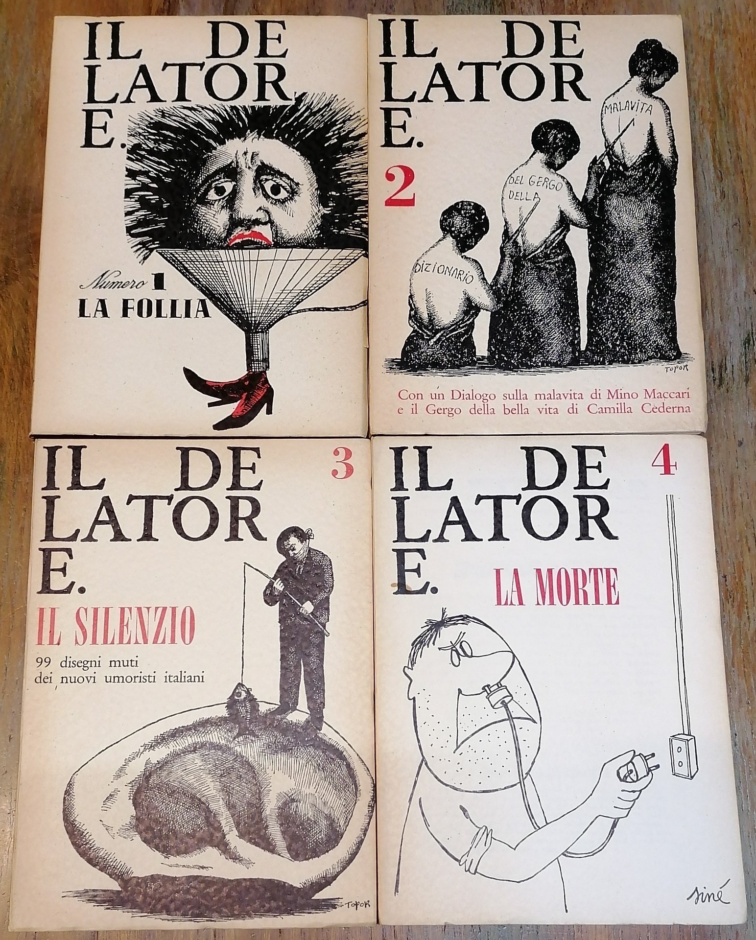 Quattro numeri della seconda serie della rivista diretta da Bernardino Zapponi, non è presente il quinto ed ultimo fascicolo "I travestiti" stampato nel marzo 1965. In 8°, brossure editoriali con copertine illustrate da Topor e Siné, numerose figure ed illustrazioni nel testo, pagine n.n. di inserzioni pubblicitarie in fine. N. 1 : "La Follia", marzo 1964, pp. 103,(9). N. 2 : "Dizionario del gergo della malavita italiana", giugno 1964, pp. 119,(9). N. 3 : "Il silenzio, 99 disegni muti dei nuovi umoristi italiani", settembre 1964, pp. 86,(10). N. 4 : "La morte", dicembre 1964, pp. 107,(13). Ben conservati con solo alcune lievi bruniture alle brossure.