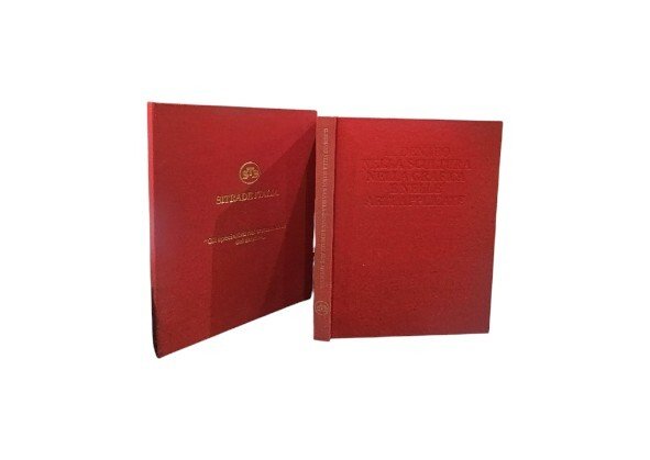 Rilegato in tutta tela rossa entro cofanetto in tutta tela rossa