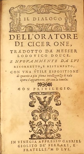 Il Dialogo dell'Oratore, di Cicerone tradotto da Messer Lodovico Dolce. Unito a : Brevi annotationi di M. Lodovico Dolce ne i tre libri del Dialogo dell’Oratore di Cicerone.