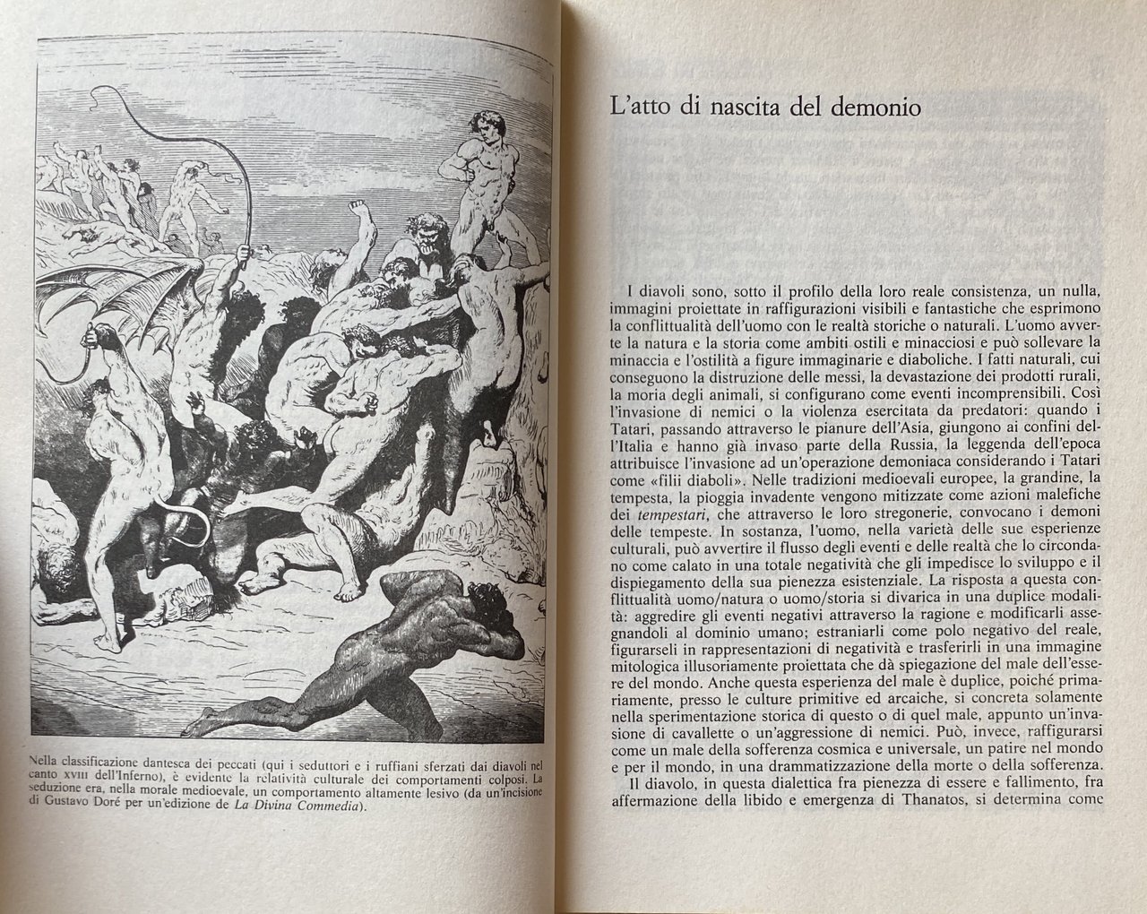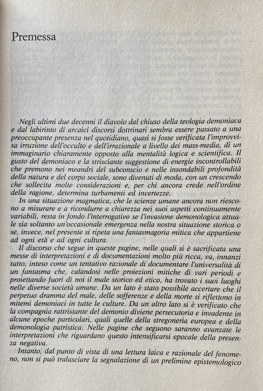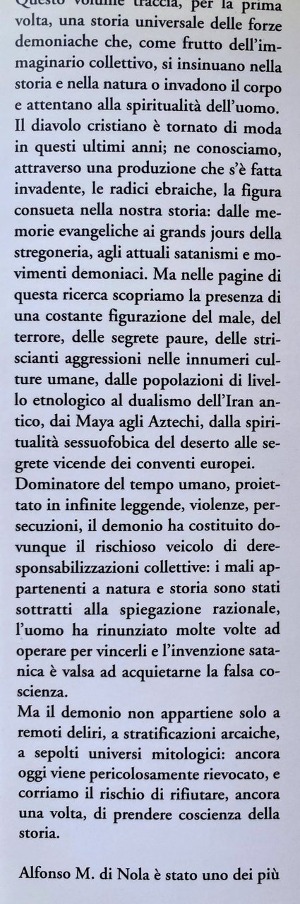Questo volume traccia, per la prima volta, una storia universale delle forze demoniache che, come frutto dell'immaginario collettivo, si insinuano nella storia e nella natura o invadono il corpo e attentano alla spiritualità dell'uomo. Il diavolo cristiano è tornato di moda in questi ultimi anni; ne conosciamo, attraverso una produzione che s'è fatta invadente, le radici ebraiche, la figura consueta nella nostra storia: dalle memorie evangeliche ai grands jours della stregoneria, agli attuali satanismi e movimenti demoniaci. Ma nelle pagine di questa ricerca scopriamo la presenza di una costante figurazione del male, del terrore, delle segrete paure, delle striscianti aggressioni nelle innumeri culture umane, dalle popolazioni di livello etnologico al dualismo dell'Iran antico, dai Maya agli Aztechi, dalla spiritualità sessuofobica del deserto alle segrete vicende dei conventi europei. Dominatore del tempo umano, proiettato in infinite leggende, violenze, persecuzioni, il demonio ha costituito dovunque il rischioso veicolo di deresponsabilizzazioni collettive: i mali appartenenti a natura e storia sono stati sottratti alla spiegazione razionale, l'uomo ha rinunziato molte volte ad operare per vincerli e l'invenzione satanica è valsa ad acquietarne la falsa coscienza. Ma il demonio non appartiene solo a remoti deliri, a stratificazioni arcaiche, a sepolti universi mitologici: ancora oggi viene pericolosamente rievocato, e corriamo il rischio di rifiutare, ancora una volta, di prendere coscienza della storia.