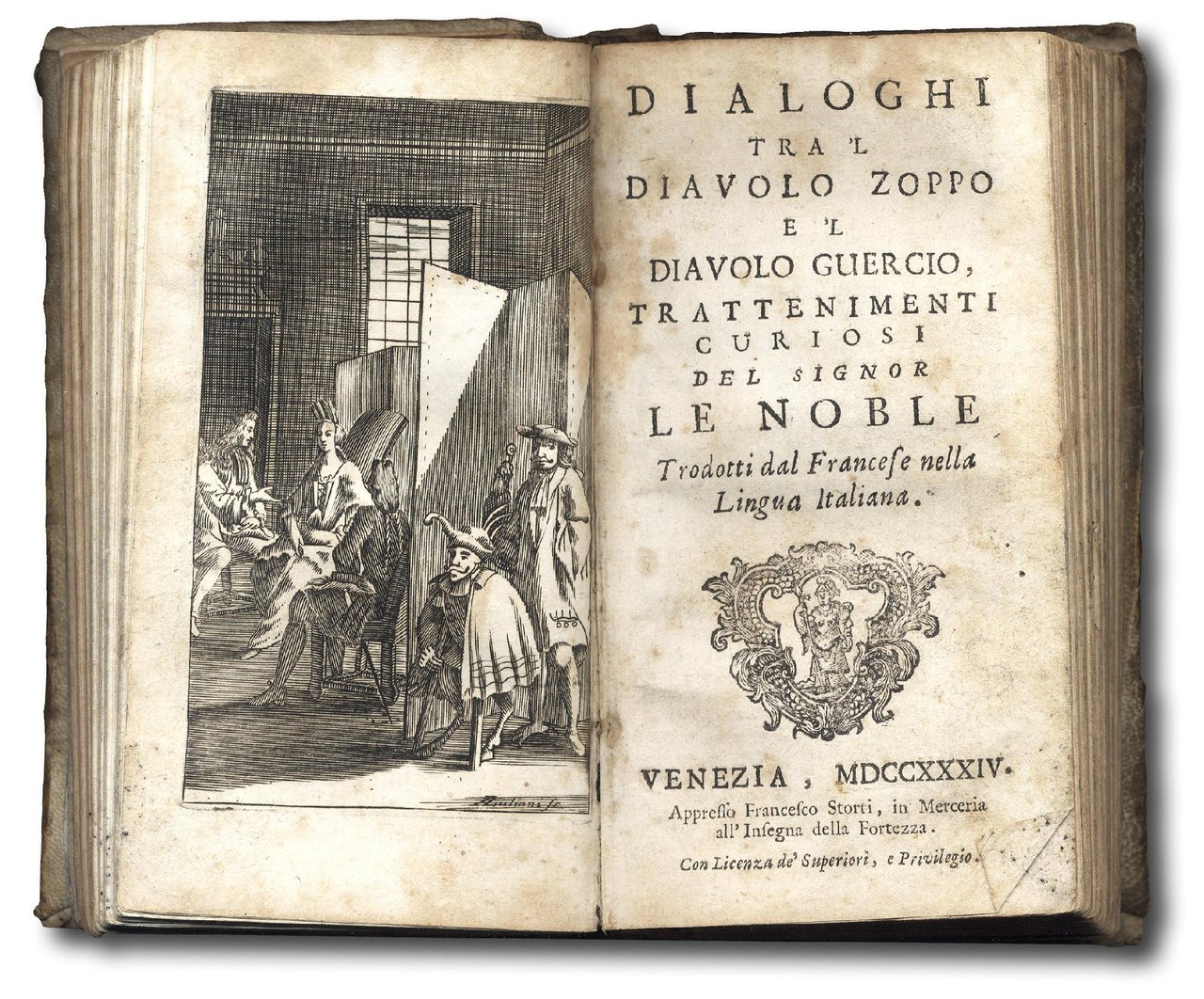 >3 opere in 1 vol. in-12, pp. (12), 216; 249; (16), 128, legatura coeva in p. pergamena, tit. manoscritto al dorso. Con tre tipiche incisioni in rame, una in antiporta ad ognuna delle tre parti. Nella prefazione al lettore lo stampatore sottolinea l'origine francese dello scritto e dichiara che ci si è attenuti ad una traduzione letterale. L'autore dell'opera è un certo Monsù Le Noble, come indicato nella premessa della seconda parte. Nella prefazione si dichiara pure di aver voluto comporre un'ideale prosecuzione delle opere di Monsù le Noble. Si tratta di una raccolta di dialoghi, tradotti dal francese, tra diavoli ambientati in contesti differenti (in piazza, al caffè, in teatro). Interessante e assai curioso assieme di tre opere della letteratura goliardica e scherzosa sul diavolo. Raro, esemplare completo, con lieve arrossatura della carta, fioriture, macchie di muffa e qualche lavoro di tarlo marginale. Non reperito nelle bibliografie.