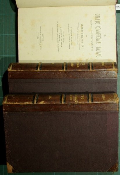 Esposto sistematicamente - Seconda edizione interamente riveduta e corretta - in 8° - pp.XII + 447; 736; 603 - Mezza pelle con titolo e fregi in oro al dorso nervato - Tre volumi - Tagli colorati - Timbro agli occhielli, lievi fioriture in poche pagine - Vol. I: Il commercio ed il suo oggetto. Il soggetto. Gli istituti creati per l'esercizio del commercio; Vol. II: Teorica delle obbligazioni. Contratti di società. Speculazioni su le cose e sul lavoro; Vol. III: Speculazioni su valori e su rischio. I quasi-contratti