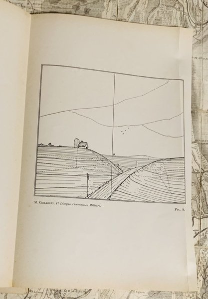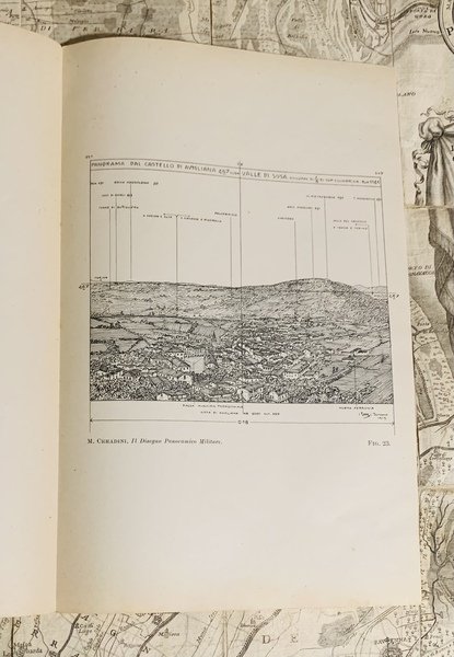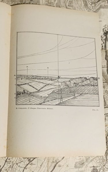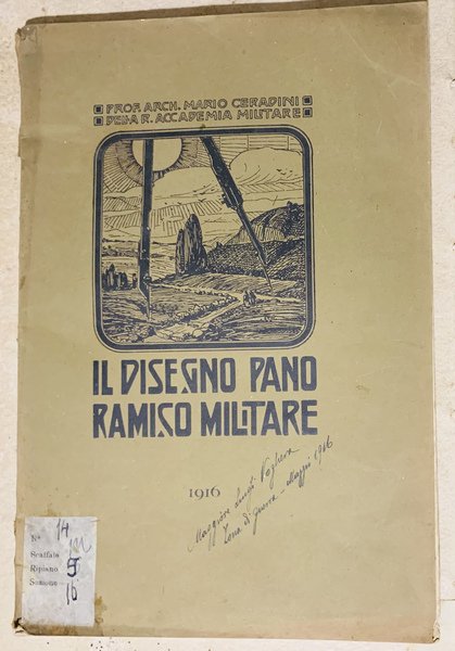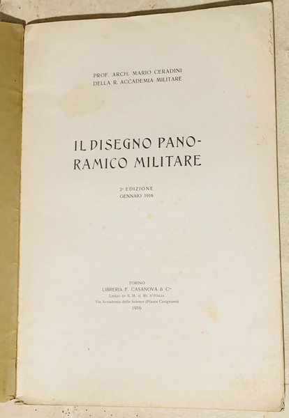 In 8° (31,5x21); (3), 30, (1), pp. e 27 c. di tavole ripiegate (progetto e componentistica dell'artiglieri). Brossura editoriale con titolo e incisione xilografica in nero al piatto anteriore. Lievi bruniture in alcune carte. Rarissima edizione, di questo importante testo, basilare per la comprensione della strategia bellica italiana e il funzionamento delle armi nel periodo della Prima Guerra Mondiale. Ex-libris privato applicato in antiporta e precetta con collocazione al piatto posteriore. Le carte fuori testo riguardano: panorama del castello di Avigliana 467 m. valle di Susa; panorama circolare del castello di Avigliana. "Comunicazione che l'ufficiale esploratore fa al suo Comandante". Prospettiva panoramica. Impostazione. Analisi del terreno. Profili delle masse. Particolarità del terreno. Esecuzione. Critica. Panorama circolare. Schizzi a memoria. Esemplare in buone ottime condizioni di conservazione, raro.