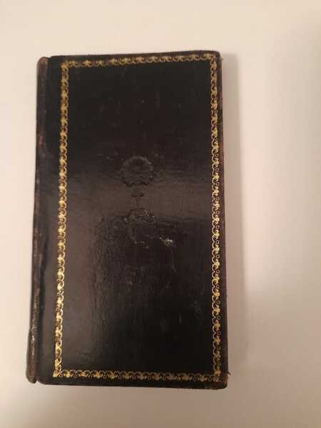 Volume in 16°. Bella Legatura in pelle nera con fregi e cornice al centro dei piatti.