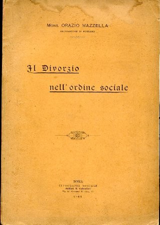 In-8°, pp. 81, brossura editoriale (una lieve gora al margine superiore del piatto). Buon esemplare. Disamina della questione del divorzio compiuta, alla luce della morale cristiana, dall'Arcivescovo di Rossano, in provincia di Cosenza. Estratto da 'La Palestra del Clero', XXV, vol. L, fascicoli 3-15. L'opuscolo era venduto presso la Curia Arcivescovile di Rossano Calabro, a beneficio dell'Orfanatrofio dell'Archiropita.