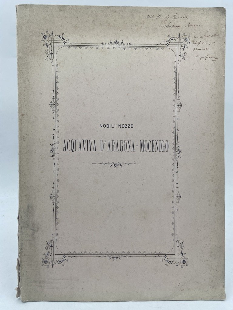 Brossura editoriale a stampa, cm 24 x 17, pp 36 (2). Difetti e dedica sulla copertina. Opuscolo per nozze (Acquaviva d’Aragona - Mocenigo).