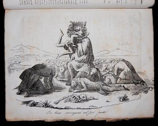 31,2x24 cm per il Don Pirlone originale, Legatura coeva in tutto cartoncino rigido foderato con bella carta marmorizzata blu coeva. Prima edizione. Opera completa di tutti i 234 numeri pubblicati. Allinterno i numeri si presentano ad ampi margini, in parte in barbe ed in buone-ottime condizioni di conservazione. Su ogni numero, al frontespizio, la celebre immagine della Maschera del Don Pirlone con il cappello a falda larga a sovrastare il motto Intendami chi può, chi mintendio ispirata da una maschera senese del 1711 che voleva raffigura lottuso benpensante. Opera assai rara a trovarsi completa di tutti i numeri. Le tipografie che pubblicarono il giornale, uscito dal 1 settembre del 1848 al 2 luglio del 1849, cambiarono più volte durante i mesi di uscita passando da Natali a Pallade e da Bertinelli a Pierra. Il Don Pirlone è passato alla storia in quanto fu il primo giornale che attaccò senza remore e con uno stile satirico estremamente graffiante il governo pontificio e numerosi suoi alti funzionari. In modo particolare, dopo la fuga del pontefice da Roma, allo scoppio dei moti rivoluzionari, il Don Pirlone contribuì ad attizzare il clima politico romano. Lopera presenta in ogni numero un grande disegno satirico a piena pagina realizzato dal celebre pittore, disegnatore, incisore, litografo, illustratore e caricaturista italiano nato ad Aviano nel 1813, Antonio Musatti. Il giornale nacque nel 1848 ad opera dei liberali dell'Epoca che ne andarono a costituire il gruppo redazionale. Tra essi quello che ne divenne il direttore, Michelangelo Pinto. La fama del giornale fu tale che allepoca del suo maggior successo arrivò a toccare i 1.200 abbonamenti, numero altissimo per un giornale cittadino dellepoca anche se nel Don Pirlone non mancano numerosi articoli inerenti a fatti di interesse italiano. Gli articoli in esso contenuti, come anche il nome dellautore delle vignette rimasero a lungo anonimi. Il giornale, si ritiene oggi, ebbe un ruolo fondamentale dispirazione per la maggior parte dei giornali risorgimentali. Già dopo i primi numeri il giornale attirò lattenzione del ministro degli interni Pellegrino Rossi, che tentò più volte di farlo chiudere tramite l'intervento del Consiglio di censura. La sua uscita si concluse nel 1849 con la fine della breve ma intensa esperienza della Repubblica Romana dopo averne anticipato lavvento ed averne accompagnato la nascita e lo sviluppo. Bibl. Rif.: Molinari, La Stampa periodica romana dell'Ottocento, I, pp. 317-18.