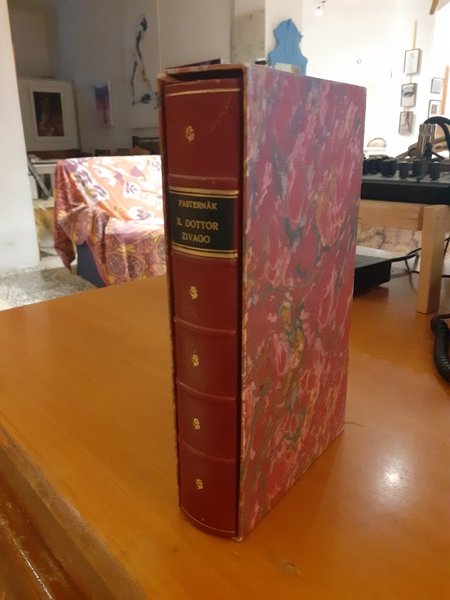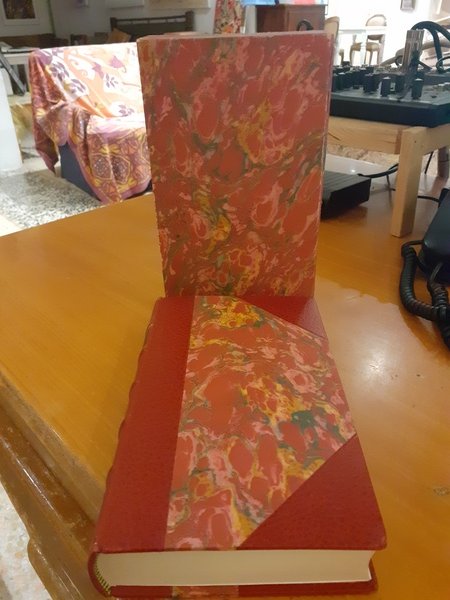 Rilegatura in mezza pelle Rigoldi, con cofanetto in carta marmorizzata, scritte, decorazioni e taglio superiore in oro zecchino.