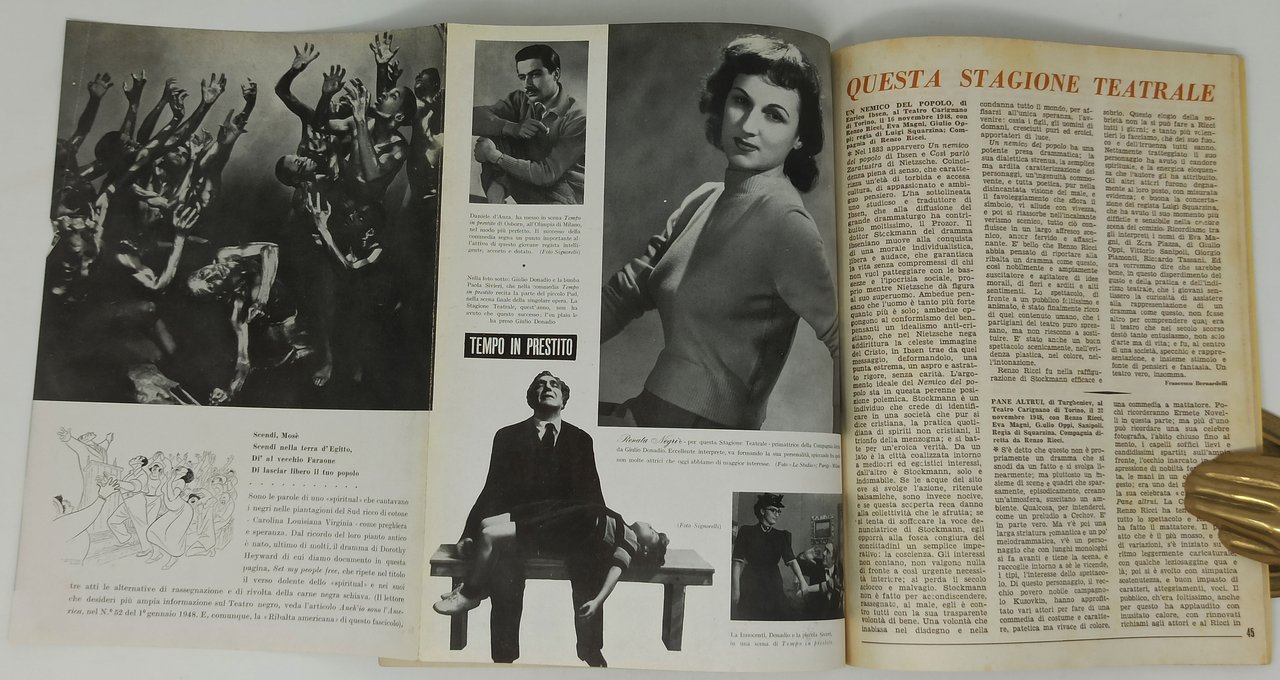 Piccolo Lotto composto di 2 numeri della rivista 'Il Dramma', pubblicati, a Torino, nel 1948 (anno 24°). Numeri presenti in questo lotto: n. 73 (15 novembre), n. 74 (1° Dicembre). Lingua del testo: Italiano. Pagine numerate: circa 60 a numero. Dimensioni: 18 x 24 cm circa. Stato di conservazione: Segni del tempo e dell'utilizzo (qualche leggero ingiallimento della carta) ma,nel complesso, buoni esemplari. Privi di scritte, sottolineature o altri segni nel testo.Conservano anche la fascietta in carta originale (pubblicitaria). Quella del n. 74, è stata strappata (per essere aperta) ma è comunque integra. In ogni numero è presente una commedia in tre atti e altre notizie relative al teatro e allo spettacolo.; Commedie presenti:; 'Le Piccole Volpi. Vicenda in tre atti di Lillian Hellman / Versione italiana di Ada Salvatore'; 'Il Leone della piazza. Commedia in tre atti e due quadri di IlJa Eremburg / versione italiana di Andrea Jemma'