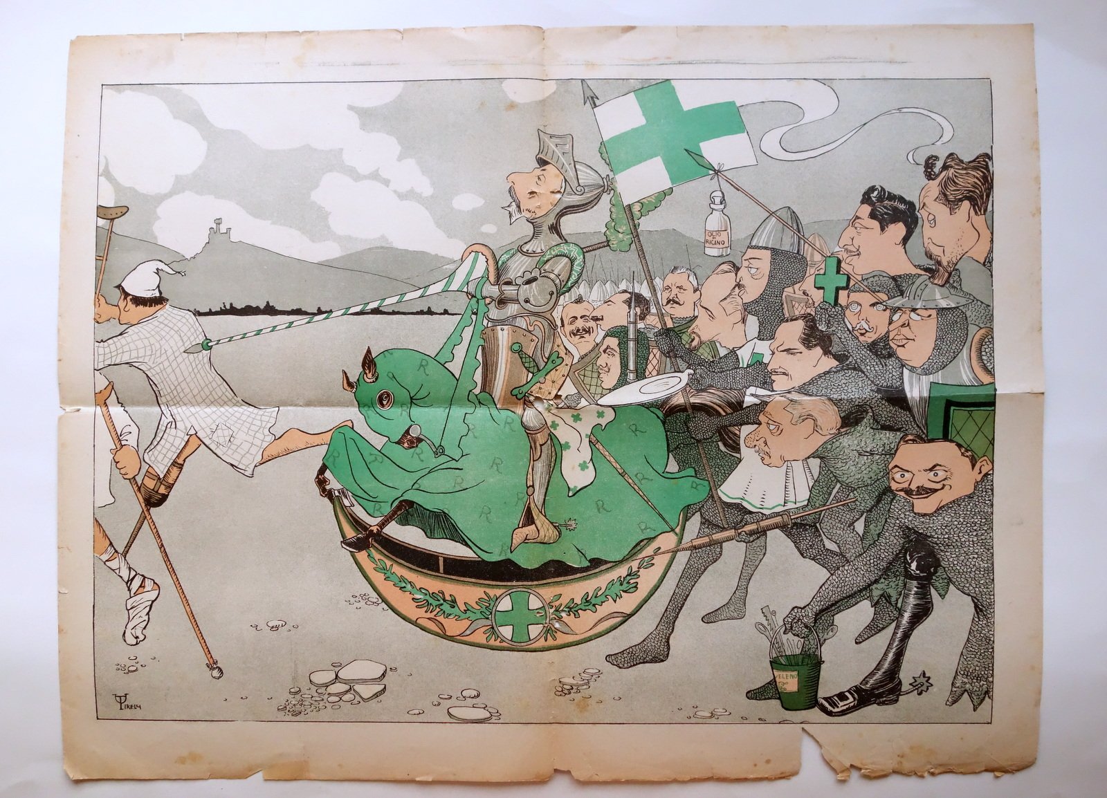 Rivista, Il Duca Borso" anno 5 - numero 25 Modena, 18 dicembre 1904 Modena 1904; cm 50x32; pp. 4 non num. (bifolio) con bella tavola cromolitografica su doppia pagina centrale di U. Tirelli. Numero completo. Condizioni di conservazione Condizioni complessivamente buone con tracce d'uso, piega centrale di conservazione, dorso e margini con alcuni piccoli / minimi strappetti e poche piccole mancanze (vedi foto); alcune piccole leggere bruniture. Per maggiori dettagli vedi foto. Bella tavola cromolitografica a colori a doppia pagina del Tirelli. Completo. SC03.D18481 N "