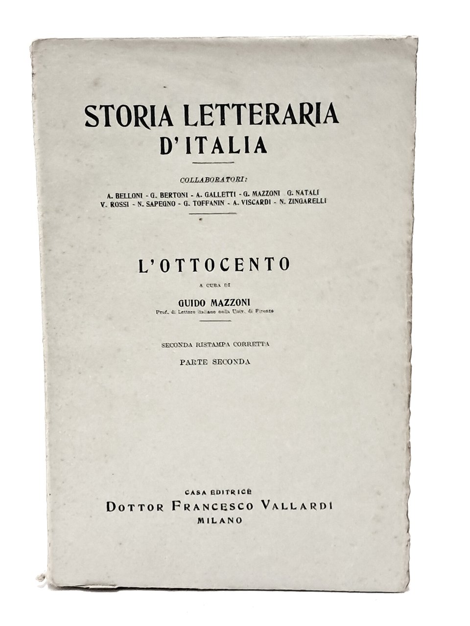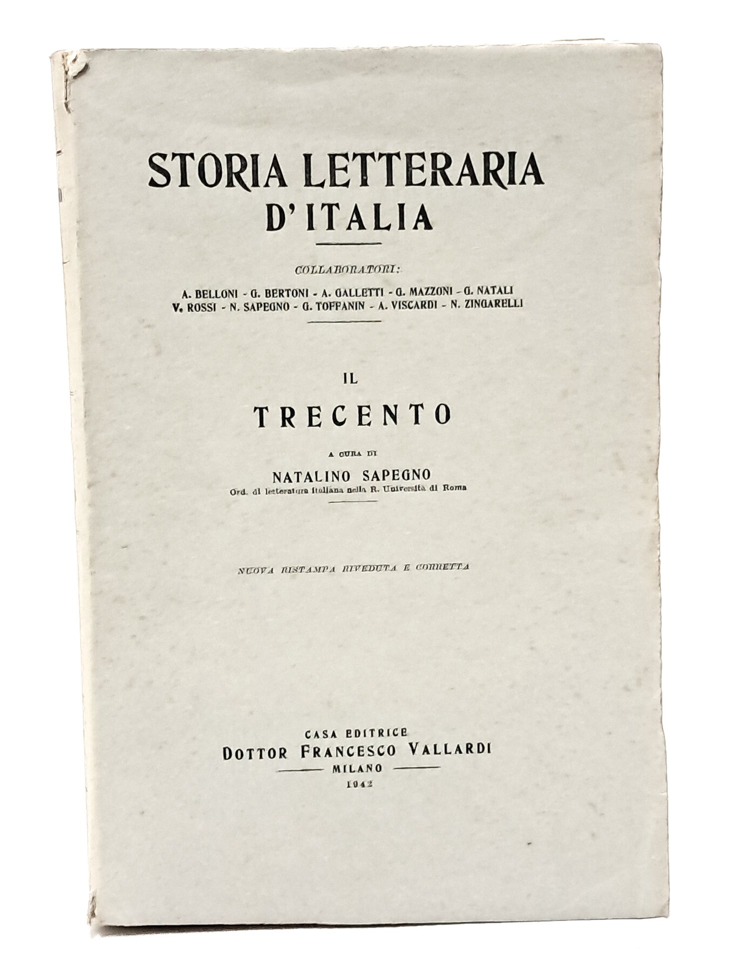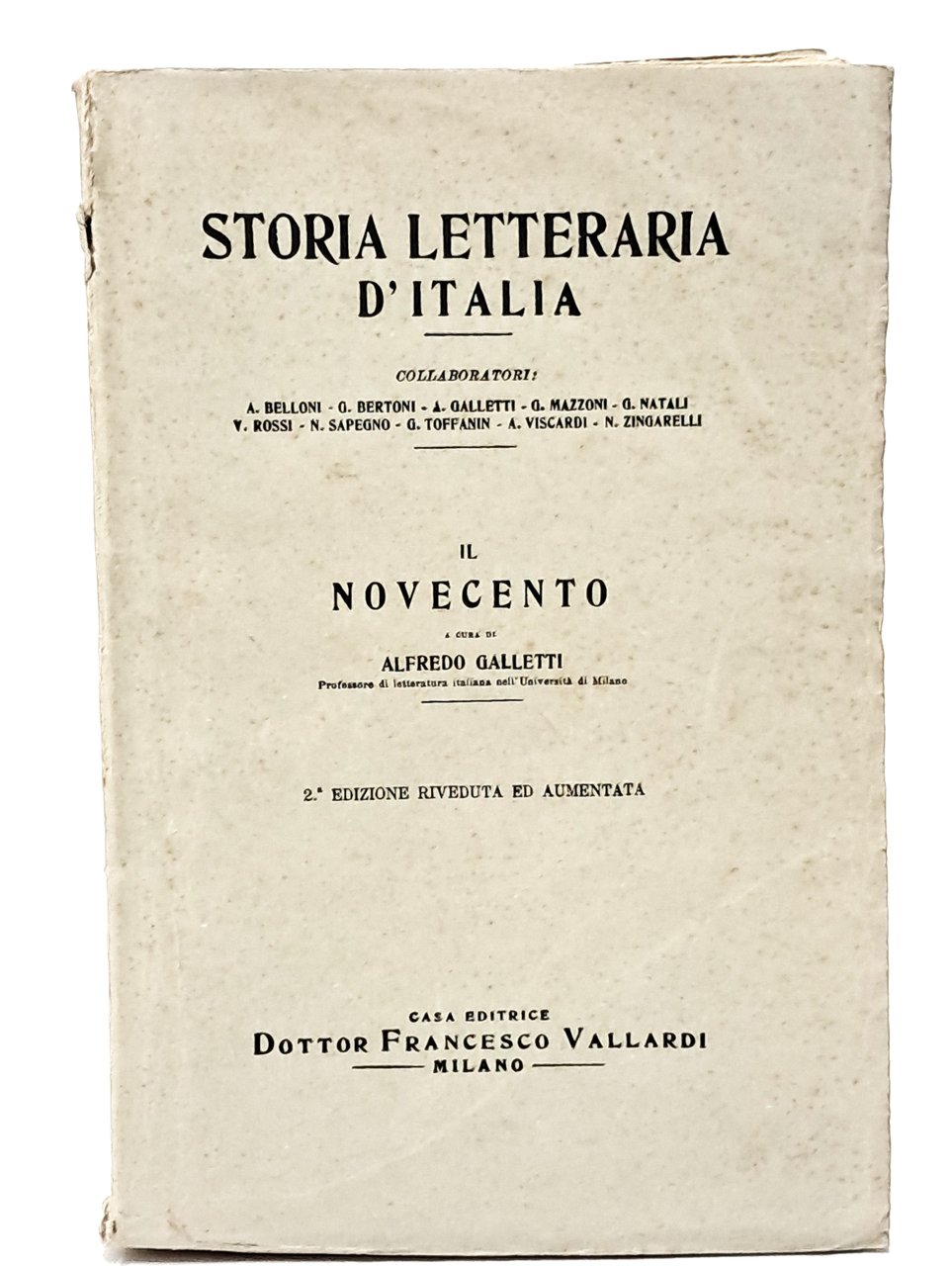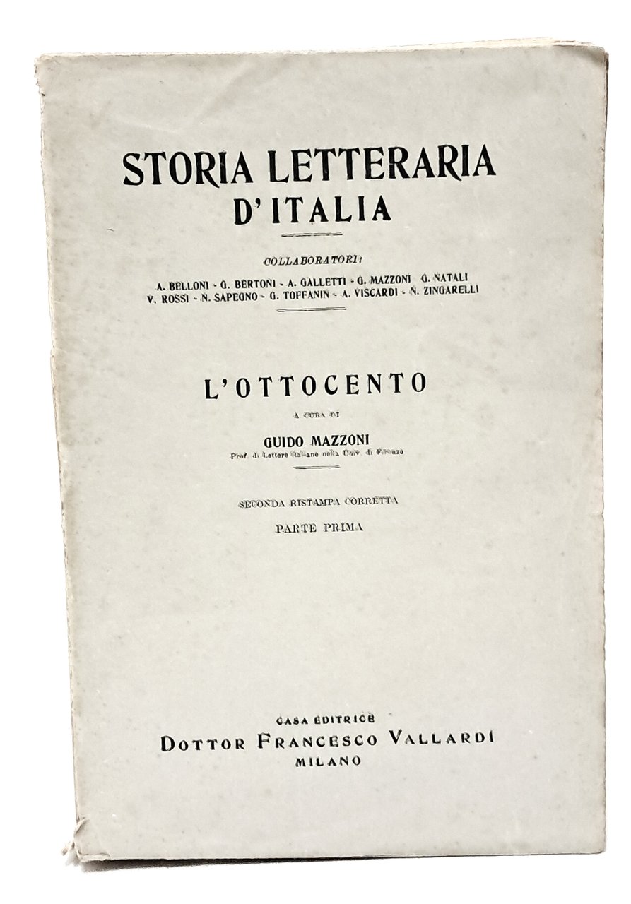 Ristampa riveduta e corretta. Storia letteraria d'Italia. Opera di carattere critico ed espositivo che analizza la storia letteraria italiana dalle sue origini fino alla prima metà del XX secolo. Piano dell’opera: Le origini, di A. Viscardi Il Duecento, di G. Bertoni Dante (voll. I e II), di M. Apollonio Il Trecento, di N. Sapegno Il Quattrocento, di V. Rossi Il Cinquecento, di G. Toffanin Il Seicento, di C. Jannaco Il Settecento (voll. I e II), di G. Natali L’Ottocento (voll. I e II), di G. Mazzoni Il Novecento, di Galletti Alfredo Sono presenti dell'opera solo Il Duecento, Dante I-II, Il Trecento, Il Quattrocento, L'Ottocento I-II e Il Novecento. In brossura. Pp. 422+1388+642+575+ 1491+ 677. Buone condizioni.