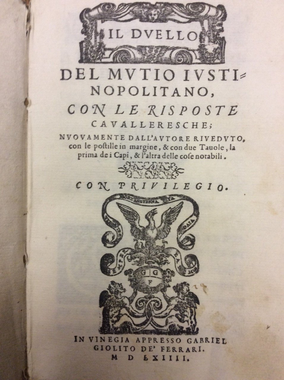 IL DUELLO DEL MUTIO IUSTINOPOLITANO, CON LE RISPOSTE CAVALLERESCHE. - Nuovamente dall'autore riveduto, con le postille in margine. & con due Tavole, la prima de i Capi, & l'altra delle cose notabili.