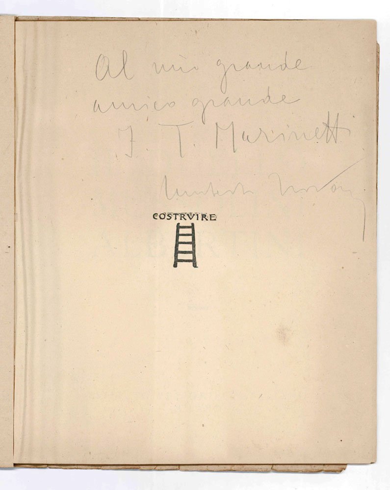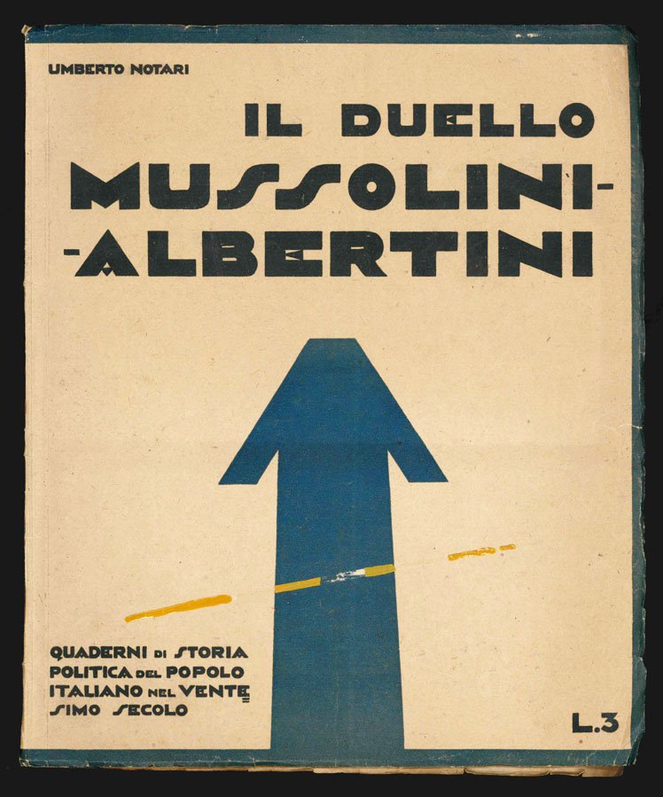 LIBROPrima edizione.CON AUTOGRAFO.Straordinario esemplare: la copia di F.T. Marinetti, con bella dedica autografa dell’autore vergata in grande alla prima carta, in grafite: «Al mio grande amico grande F.T. Marinetti | Umberto Notari». Fisiologici segni del tempo data la qualità economica dell’edizione (uniforme brunitura e lievi pieghe ai bordi, con minime lacerazioni senza perdite, lontane dal testo).Rarissimo (otto copie in Iccu, ma tutte in biblioteche specialistiche, cui Oclc aggiunge le sole copie di Stanford e Oxford). Prima raccolta in volume degli articoli uscitii sull’«Ambrosiano» tra l’agosto e il settembre 1924, a proposito delle tensioni tra Luigi Albertini e il dittatore fascista. Secondo Arrigo Cajumi si trattò di una «gaffe» che non migliorò la già non buona impressione che Mussoline aveva di Notari (Colori e veleni, p. 307).