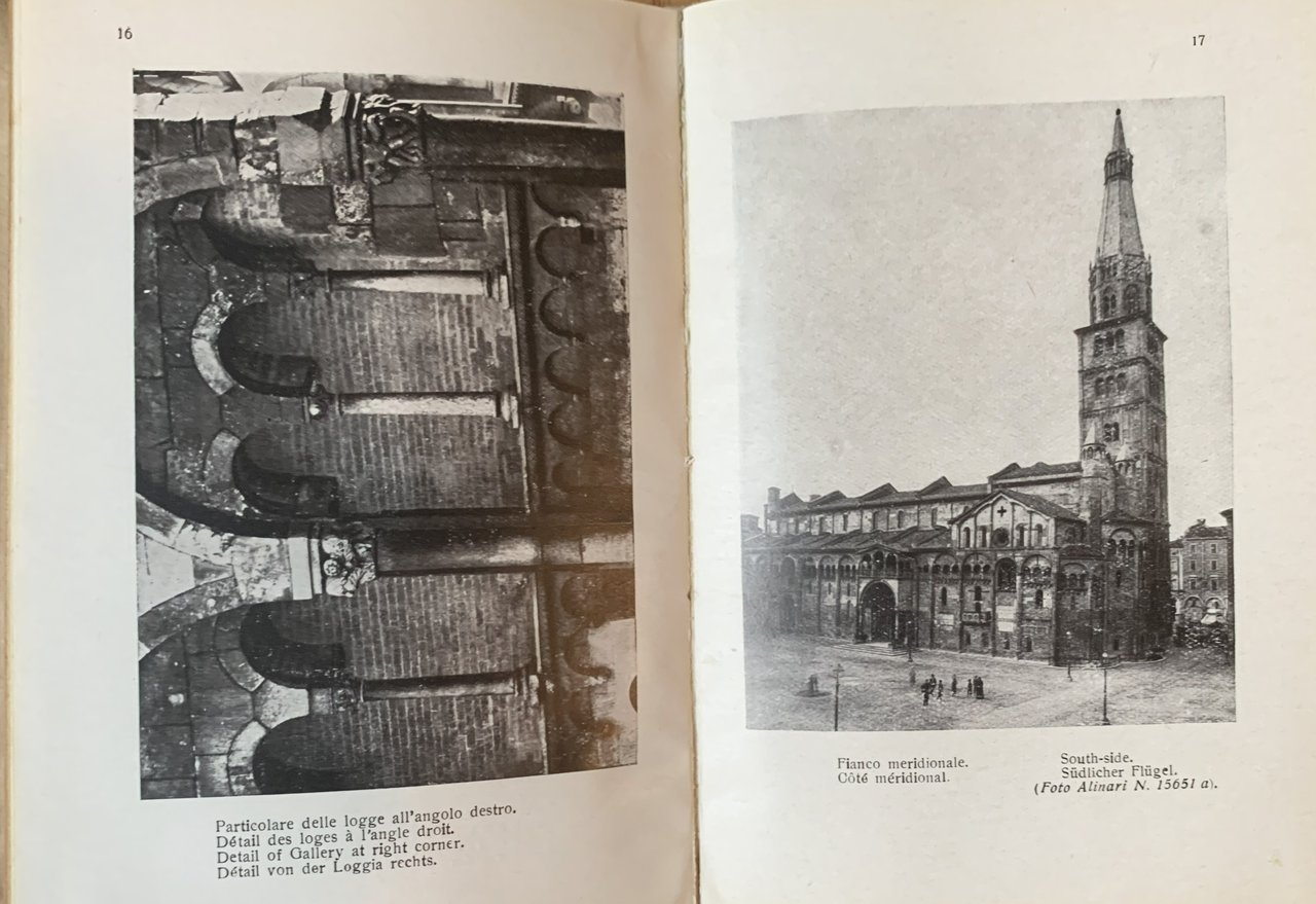 I ed.. Collezione di monografie sotto il patronato del Touring Club italiano e della "Dante Aliighieri", "L'Italia Monumentale", N. 29. Testo italiano, francese, inglese. XVI/36+64 tavole patitate contenenti altrettante riproduzioni fotografiche in b/n (foto Alinari e - alcune - della Ditta Orlandini e F. di Modena)+4 di pubblicità editoriale/brossura sovraccoperta avorio con titoli in verde e marrone entro cornice architettonica in verde che include una veduta del Duomo di Modena in marrone. Con una pianta in nero del Duomo di Modena. Stato buono (leggera usura della copertina che presenta inoltre alcune gore - pagine brunite).