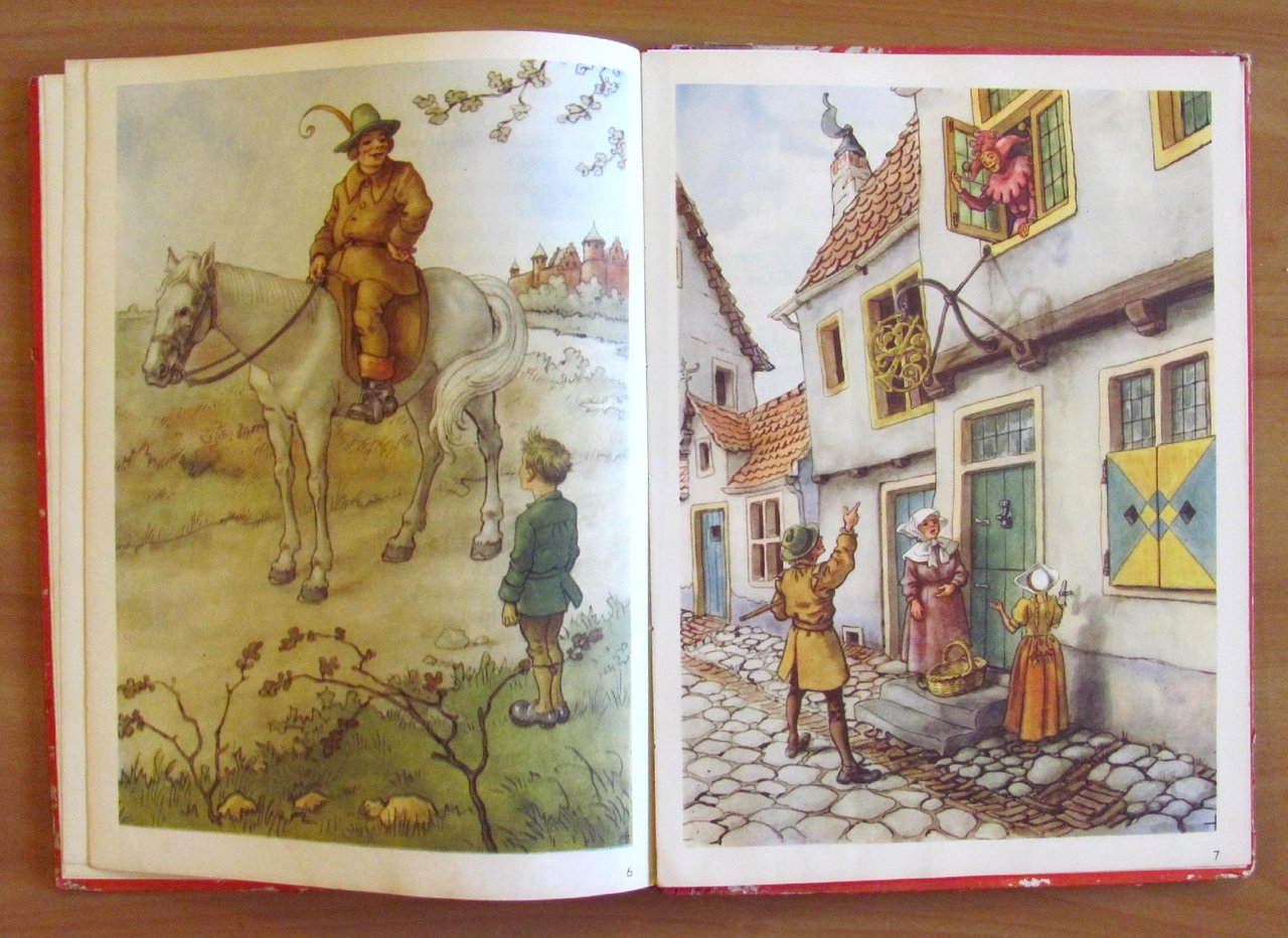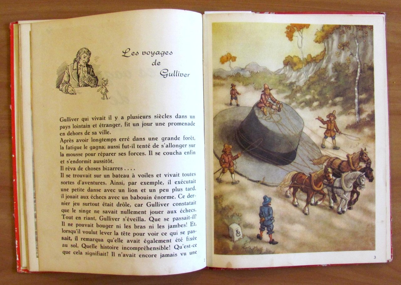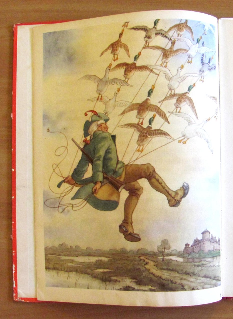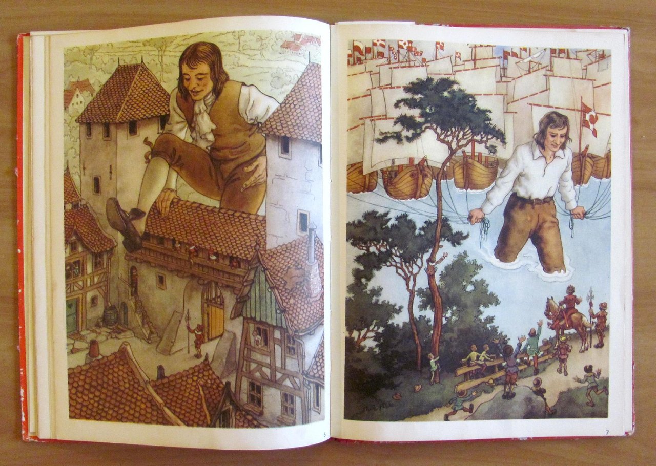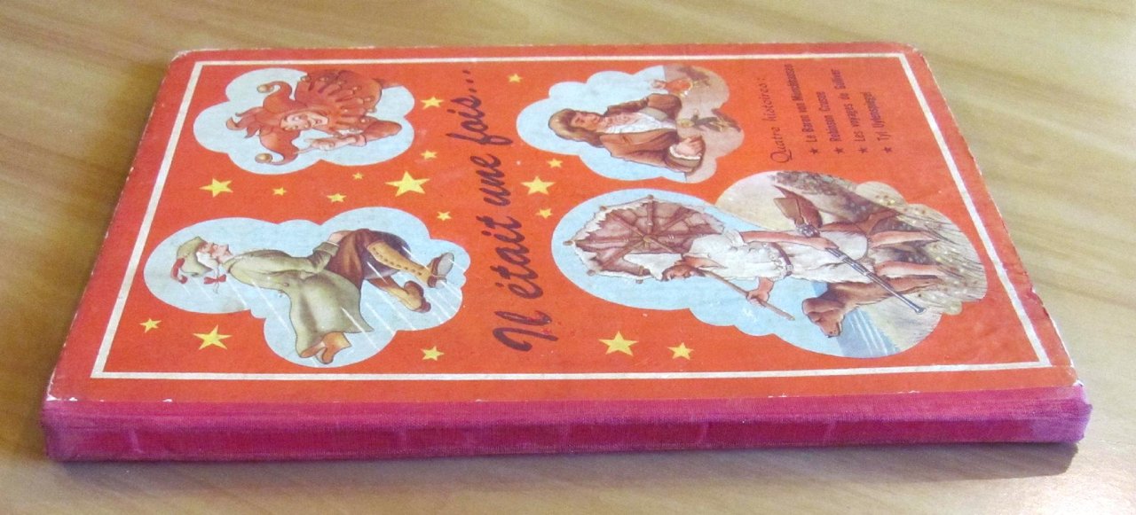 Quatre histoires: Le Baron von Munchhausen; Robinson Crusoe; Les voyages de Gulliver; Tyl Uylenspiegel. 24 splendide illustrazioni a colori a piena pagina e doppia pagina, 6 per ciascun racconto, e illustrazioni in b/n n.t. di autore Anonimo. Imprimé en Holland, s.d. anni '30/'40. Cartonato editoriale con dorso in tela originale. Spellature della carta ai margini delle copertine e alle cerniere interne delle sole copertine. Libro perfettamente legato e pulito. 23x32; pp.19 per ciascun racconto. Bellissimi libro-raccolta di 4 famosissimi personaggi d'avventura splendidamente illustrato. Raro, Buonissimo stato. , Buono (Good)