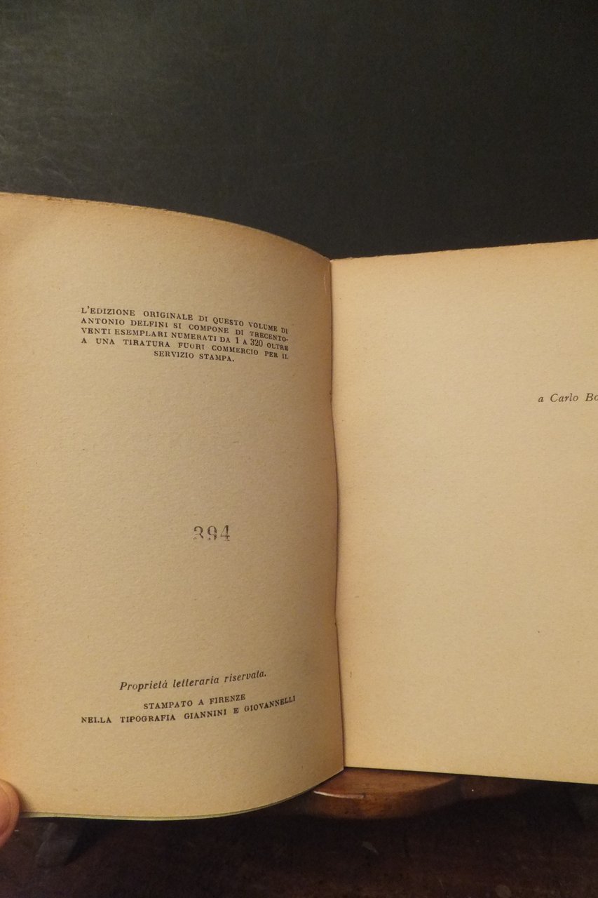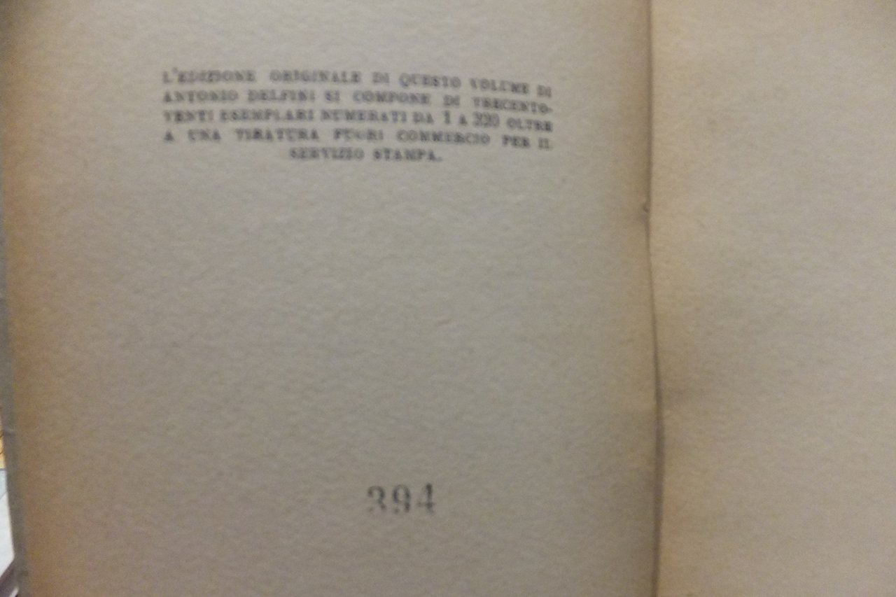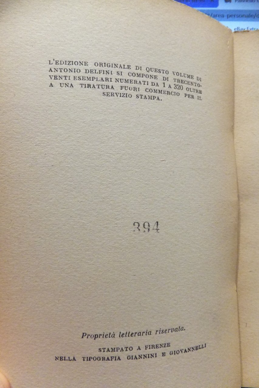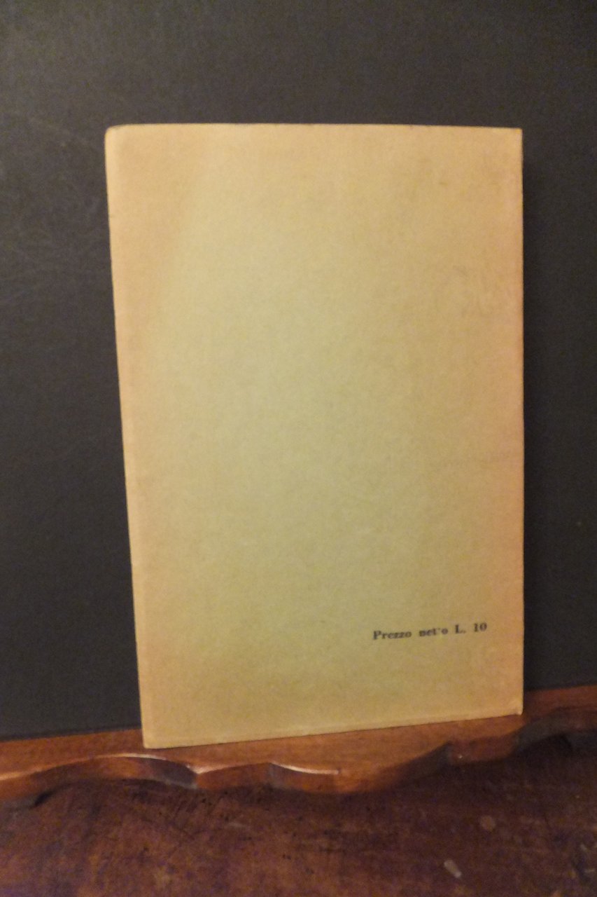 EDIZIONE DI RIVOLUZIONE FIRENZE 20 DICEMBRE 1940 - ESEMPLARE 394 - BROSSURA 19 X 12 PP. 93 - BUONE CONDIZIONI, BRUNITURE AL DORSO/PIATTI, INGIALLIMENTO FISIOLOGICO IN PARTICOLARE TAGLI/BORDO PAGINA. IL VOLUME HA SUBITO UN RESTAURO ZONA DORSO BEN RIUSCITO. -