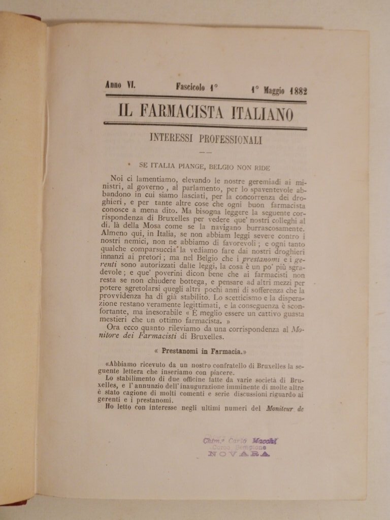 8°, cm 23, pp. 284 Legatura in mezza pelle rossa con titoli in oro al dorso. Annualità completa (anno VIII) di questa rivista compilata dal farmacista napoletano Nestore Prota Giurleo, titolare della Farmacia della Luce a Napoli. Non comune.. *** TUTTI I NOSTRI LIBRI SONO VISIBILI PREVIO CONTATTO MAIL O TELEFONO NELLA NUOVA SEDE DI MILANO: LIBRERIA COSMOPOLIS, VIA JOMMELLI, 22. ***