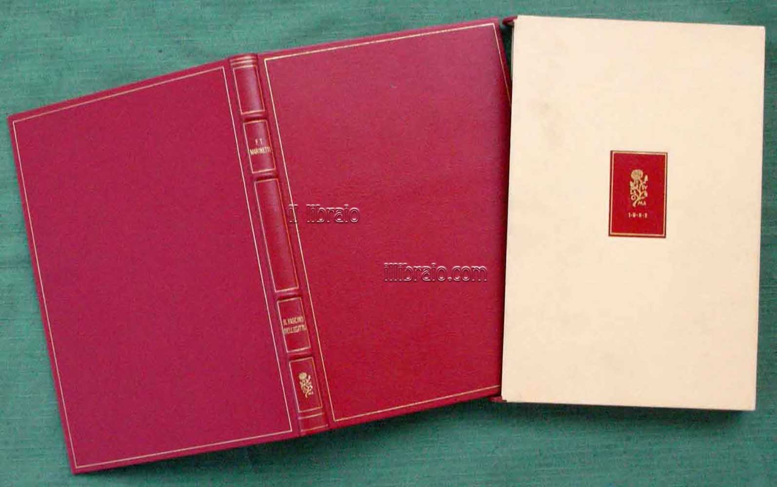 in 4°; pp. 146; leg. in piena pelle rossa con fregi in oro ai piatti e al dorso, quest'ultimo con nervature, unghiatura con fregi, astuccio. Tiratura di 300 esemplari numerati impressi con i tipi di Fogola ed.
