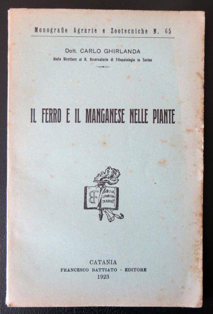 Francesco Battiato, Catania, 1923. Piccola Collezione di Monografie Agrarie e Zootecniche, N. 65. In 8vo, pp. 38, bross. orig. in carta verdina. Foxing marginale di copertina, ingiallito ma buono l'interno.