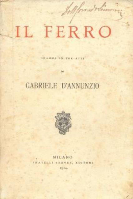 Milano, Fratelli Treves, 1914, 12esimo migliaio (prima edizione). Timbro a secco dell’Autore. In 8vo piccolo, pp. (8), 200, bross. orig. in carta con titolo in in rosso / nero. Edizione originale, senza indicazione di migliaio, dedicata "alla memoria di Gigliola De Sangro". Rispetto ad altre edizioni dannunziane, questa ha una veste tipografica talmente modesta che il poeta stesso la definì "orrenda". Il dramma fu rappresentato con successo per la prima volta a Parigi il 14 dicembre 1913, in francese e in forma diversa, con il titolo di "Le Chèvrefeuille"; sulle scene italiane apparve la sera del 27 gennaio 1914, e contemporaneamente al Carignano di Torino, al Manzoni di Milano e al Valle di Roma. Il testo originale francese fu pubblicato solo nel 1935 nel vol. XLVI dell'Edizione Nazionale (bibliografia: De Medici, p. 82. Guabello, p. 236. Vecchioni, p. 48. Falqui, p. 34). Firma di appartenenza al piatto. Brossura staccata e testo slegato, minimo foxing, comunque ben fruibile.