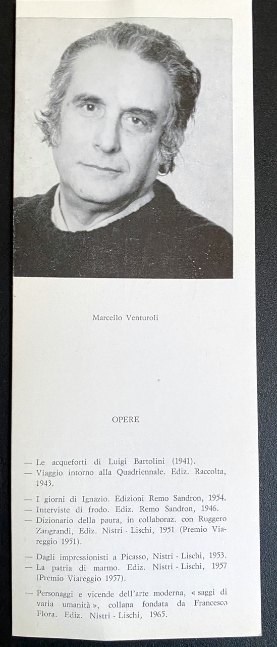 Marcello Venturoli (Roma, 1915, 2002) ha collaborato per molti anni a Paese sera come critico d'arte, tra i suoi testi di maggior impegno in campo artistico si ricordano Dagli Impressionisti a Picasso, La patria di marmo, Personaggi e vicende dell'arte moderna, Il viaggiatore in arte, Tutti gli uomini dell'arte, Le Biennali raccontate. Ha pubblicato libri di narrativa: Lo sprecadonne, Dietro il silenzio, Io, Saffo, La stella di Giuditta; e di poesia: Canto plurale, Il fiore buio, Il filo iridato, Racconti in versi e, con la prefazione di Bufalino, Come dal giorno prima. Si ricorda, in particolar modo, Il dizionario della paura che raccoglie la corrispondenza di Venturoli con Ruggero Zangrandi dal 1949 al 1951. Molte delle opere edite e inedite di Venturoli a partire dal 1979 sino al 1996 sono state revisionate da Bufalino.