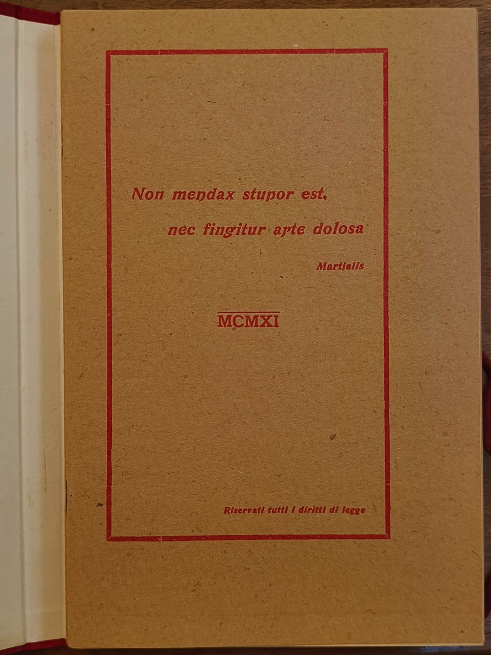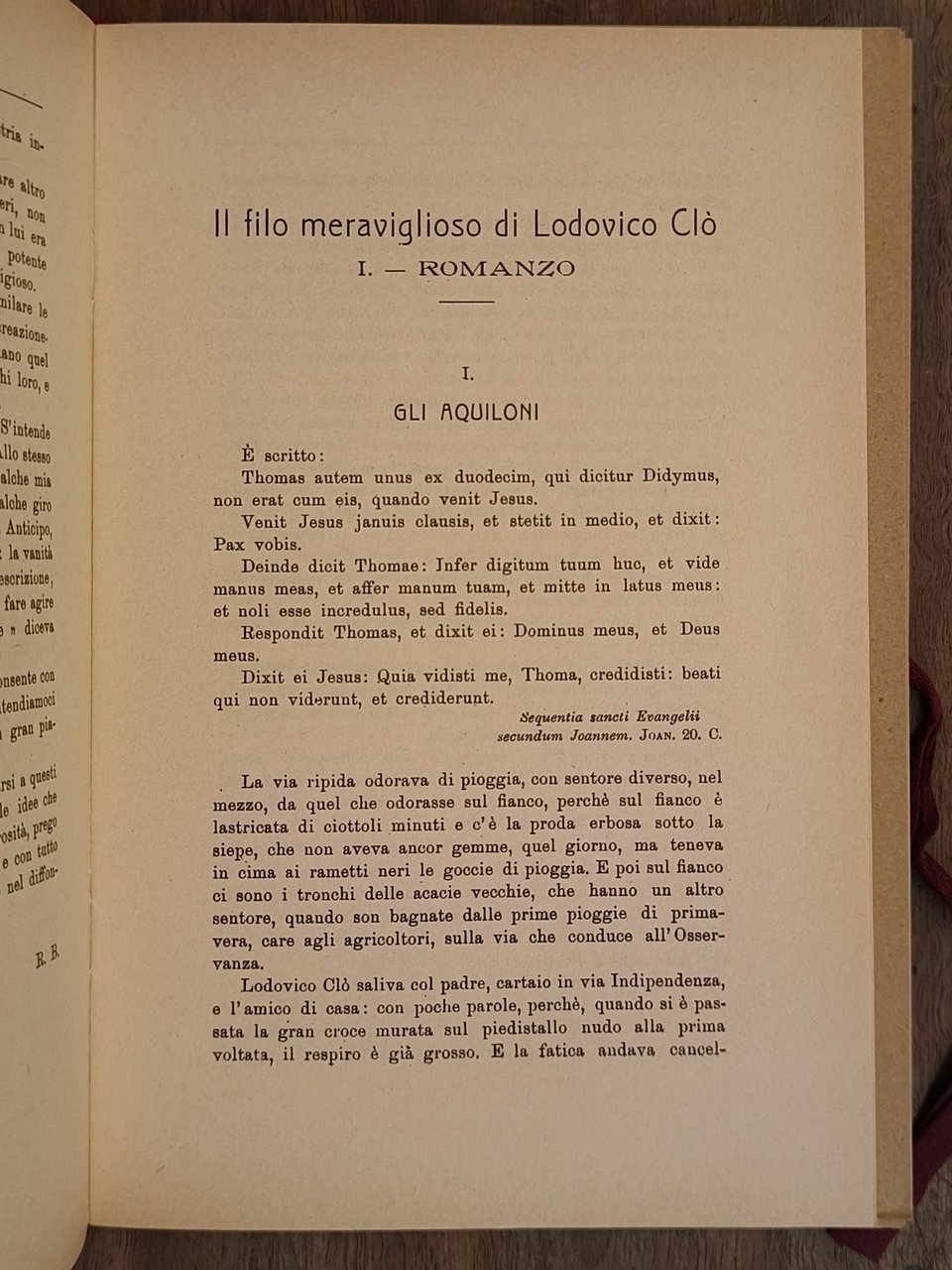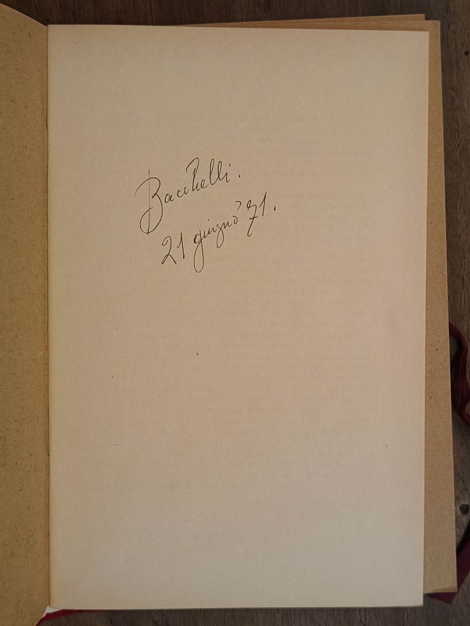 Il filo meraviglioso di Ludovico Clò, Bologna, Cassa di Risparmio, 1971. Cm 24,5. Pp. 116. Sei fascicoli in cartella editoriale in tela rossa. Ottime condizioni. Riedizione della prima opera di R. Bacchelli, riprodotta anastaticamente nel testo e ripresentata nella singolare veste originale in occasione del suo ottantesimo compleanno. Firma dell'autore al primo fascicolo, datata 21 giugno 1971.