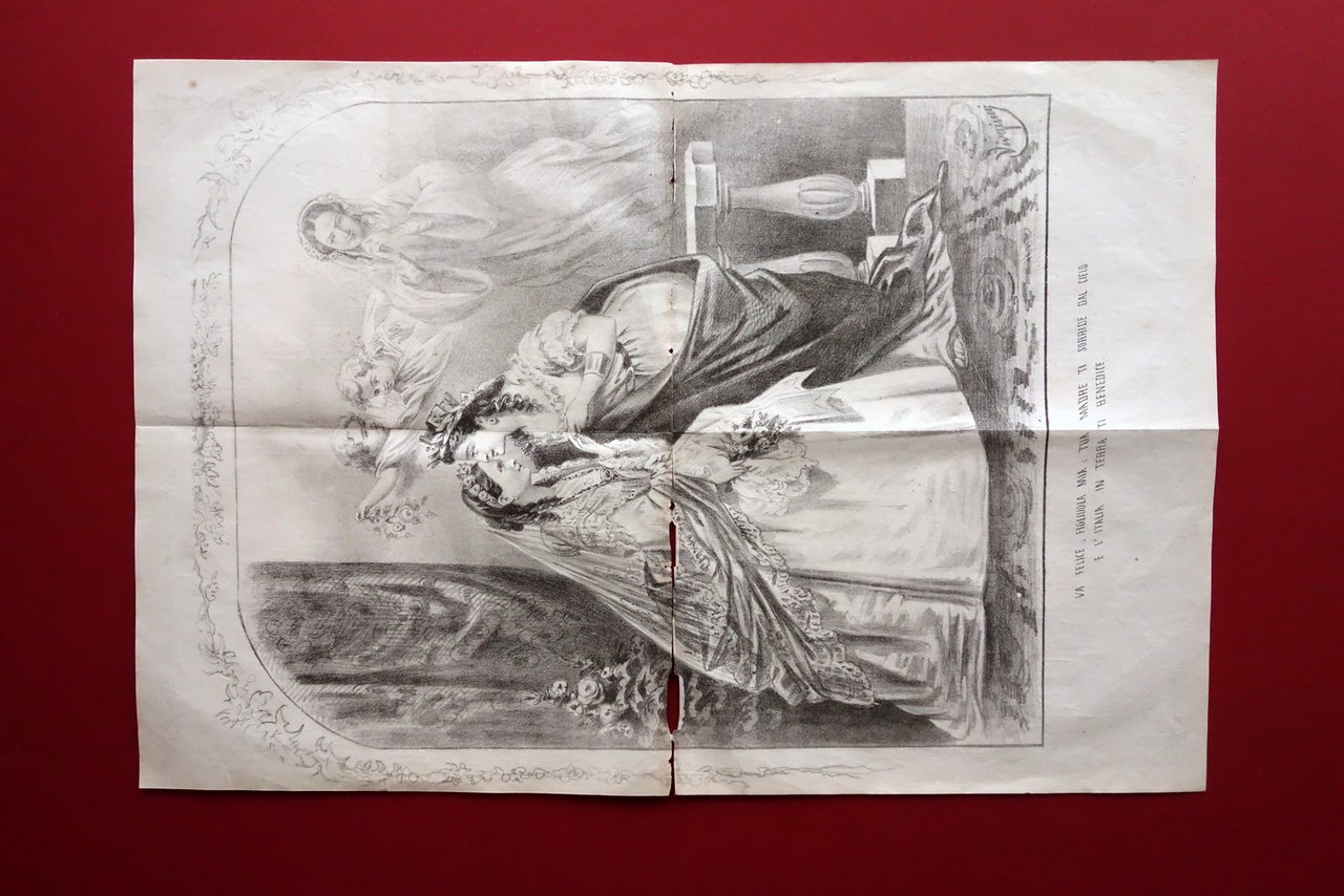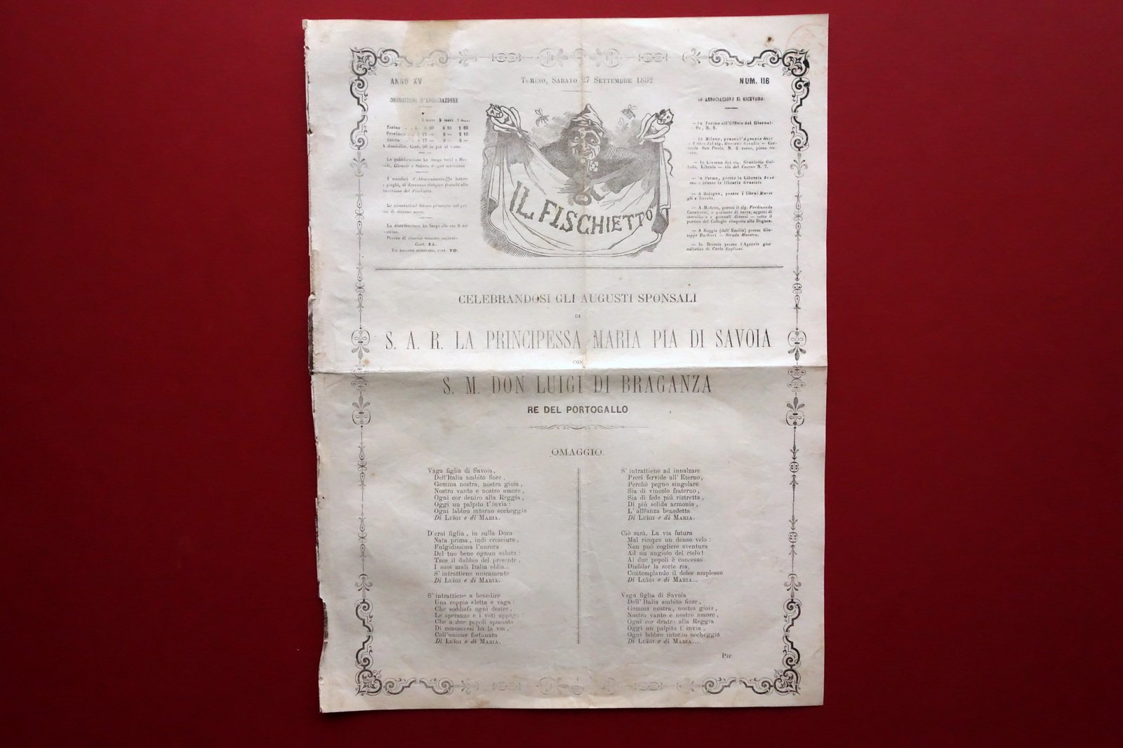 Giornale, Celebrandosi gli Augusti Sponsali di S. A. R. la Principessa Maria Pia di Savoia con S. M. Don Luigi di Braganza, Re di Portogallo [.]" ne "Il Fischietto" anno XV - numero 116 Torino, sabato 27 settembre 1862 Torino, 1862; pp. 4 (bifolio), con una grande ill. litografica su doppia pagina; numero completo. Dimensioni: cm 34,5x25,5. Condizioni di conservazione Complessivamente in buono stato con tracce d'uso, pieghe per conservazione, al dorso leggere tracce di precedente rilegatura e qualche piccolo strappetto e mancanza (vedi foto); al margine superiore delle prime due pagine strappetto di qualche cm restaurato. Leggerissimo foxing. Numero monografico, dedicato alle nozze tra la Principessa Maria Pia di Savoia e il Re del Portogallo Luigi di Braganza. Alla doppia pagina interna bella illustazione litografica (vedi foto). SC03.D19751 N F "