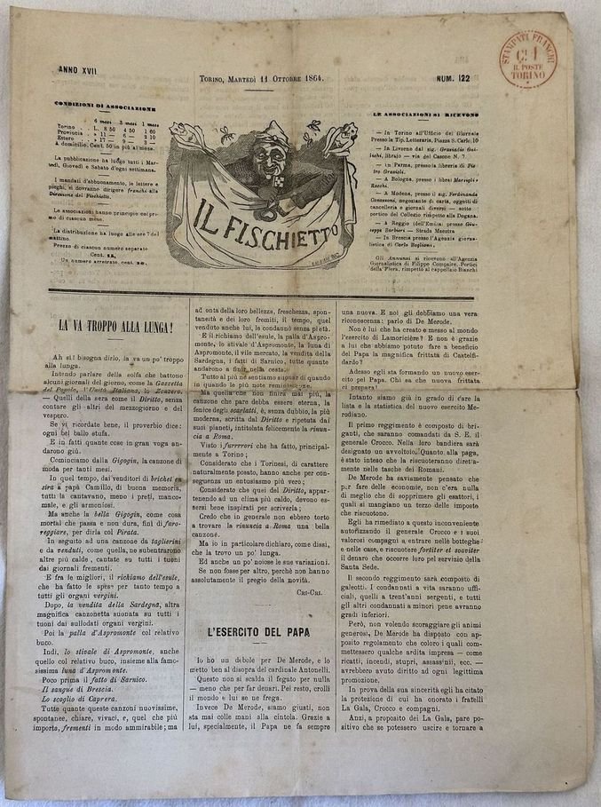 Numero del 11 ottobre 1864 dell'almanacco satirico torinese "Il fischietto". I brani all'interno: La canzone di Gigogin, L'esercito del Papa (De Morede), L'Otello al teatro Vittorio Emanuele, Frastaglie ciarpe (Pepoli, Papa, Messer Francesco Domenico.Un illustrazione a piena pagina di Teja: Fischietto e Gianduia. In discrete condizioni. Copertina editoriale in mediocri condizioni generali con usure e strappi marginali. Legatura quasi assente. Pagine in buone condizioni con fioriture. Piegatura orizzontrale. Gora d'umidità. Angolo inferiore destro mancante. In folio. cm 36x26,5. Pp. (4) Number of 11st of october 1864 of this satyrical magazine from Turin. The texts inside: the song of Gigogin, The army of the Pope (De Morede), Otello in teatro Vittorio Emanuele, Frastaglie ciarpe (Pepoli, Papa, Messer Francesco Domenico. One full page illustrations by Teja: Fischietto e Gianduia. In fair conditions. Editorial cover in poor conditions lightly worn in the extremities. Binding almost lacks. Pages in good conditions with foxing. Lower right corner lacks. In folio. cm 36x26,5. Pp. (4).