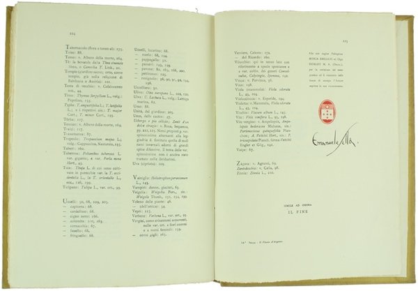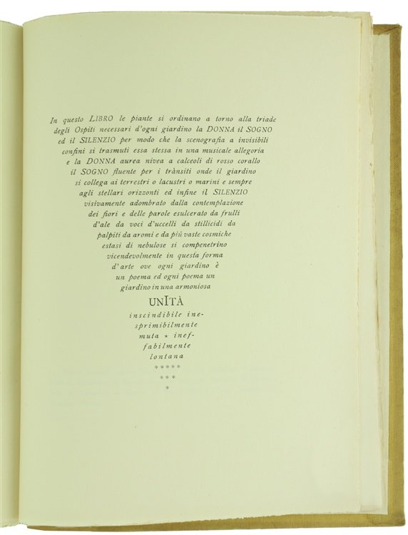 (Codice PT/0708) In 8° (23x17,5 cm) 225 pp. Una raffinata e rara preziosità bibliografica. Edizione originale su carta a mano, tiratura di 180 esemplari numerati (es. n. 116), stampata su carta Miliani di Fabriano, con i tipi elzeviriani, per cura di Pietro Caneparo Maestro dell'Arte, di Giacomo Simonelli impressore e di Luigi Ferrarotti Maestro Compositore. La "Sestina del garofano vermiglio" impressa in rosso (8 pp. in numeri romani). In fine ampio indice delle piante e dei giardini. Ex libris all'occhietto. Legatura originale in tela gialla, con lievi scuriture, titolo in rosso. Interno ottimo, pagine con grandi margini e barbe. L'autore: economista, docente universitario, poeta e saggista, pubblicista. Valle Mosso (1879) - Milano (1946). ~~~ SPEDIZIONE IN ITALIA SEMPRE TRACCIATA