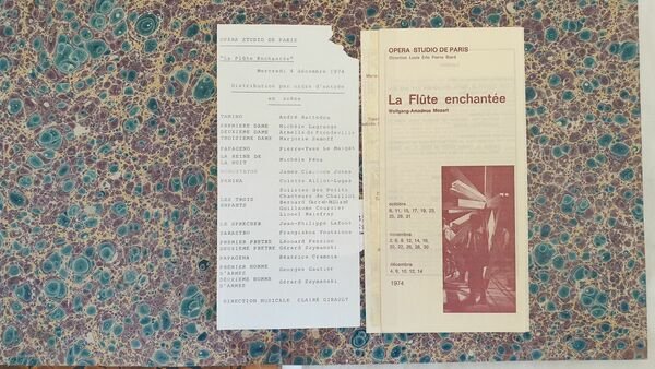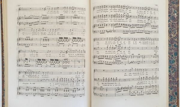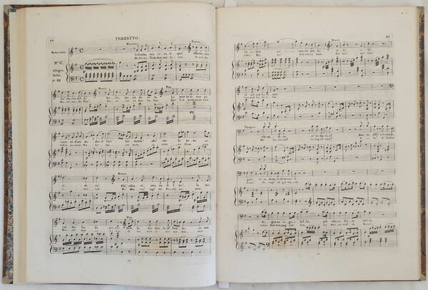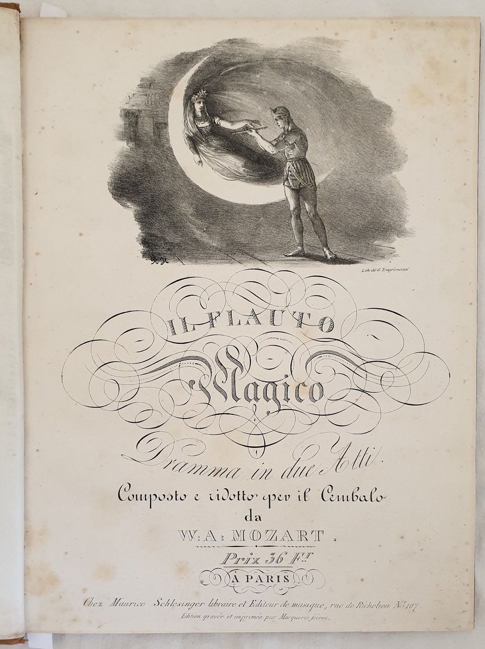 Bella edizione italiana dei pirmi dell'ottocento della partitura completa per cembalo e canto dell'opera "Il flauto magico" musicata da Wolfgang Amadeus Mozart (1756-1791). Bellissima illustrazione litografica incisa da G. Engelmann. Il canto è in testo italiano e tedesco. Insieme al volume un depliant sulla rappresentazione dell'ottobre novembre e dicembre 1974 del Flauto Magico all'Opera studio de Paris e un foglio battuto a macchina con la lista degli attori e la loro distribuzione in scena. Direttore musicale Claire Gibault. Verosimilmente il volume è stato usato come studio per questa rappresentazionee teatrale. Copertina in mezza pelle con titolo e decorazioni in oro al dorso in buone condizioni con lievi usure marginali. Legatura in buone condizioni. Pagine in ottime condizioni con fioriture. ANNO: Inizio ottocento DIMENSIONI: In folio. cm 35x26,5 PAGINE: pp. 167. Beautiful italian edition of early 19th century of the complete score for cembalo and chant of the work "Il flauto magico" with music by Wolfgang Amadeus Mozart (1756-1791). Very beautiful lythographed engraving by G. Engelmann. The chant is in italian and german language. Together with the volume a depliant about the representation of the october november and december 1974 of the Flauto Magico in the Opera studio de Paris and a typewritten page with list of the actors and their distribution in scene. Musical chief Claire Gibault. Probably the volume has been used as a study for this theatre representation. Half leather coeval cover with gilted title and decorartions in the spine in good conditions lightly worn in the extremities. Binding in good conditions. Pages in very good conditions with foxing YEAR: early 19th century SIZE: In folio. cm 35x26,5 PAGES: pp. 167
