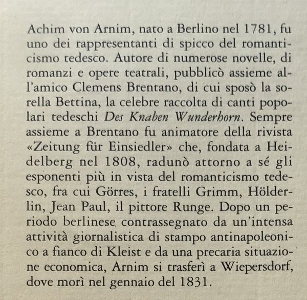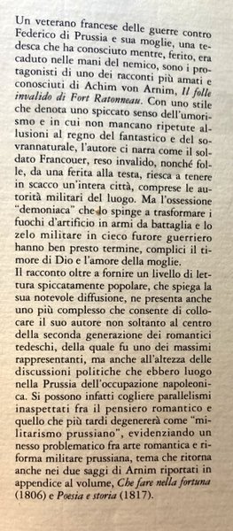 von Amims Adolfo Bioy Casares pubblica arnimiana Autori Vari bambino barcaioli Basset Berlino bimbo cameriere Carlo Sgorlon Francoeur città Clausewitz Clemens Brentano coeur colonnello colpa custodi corona diavolo donna eserciti stabili fortuna Federico ferita fiamme Holderlin forte francese fratelli Grimm Friedrich Schlegel frittata fuochi d'artificio gamba Giorgio Voghera Gneisenau Goethe Gòres Gregor von Rezzori grembiule guerra guerriero Igor Stravinskij invece Italo Svevo Jurgen Knaack Kleist invalido Lewis Carroll Ludwig madre magico fanciullo maledizione Marsiglia militare Miroslav Krleza moglie mondo alienato Napoleone novelle Otto Weininger padre Filippo Poesia storia poeta polveriera popolo Prussia racconti Rainer Maria Rilke Ratonneau Richard Wagner Rosalia sentimento signore soldati spirito spirituale stesura storico tedesco vecchio comandante