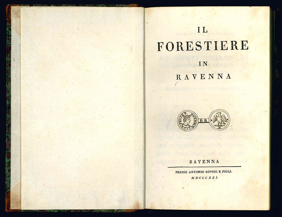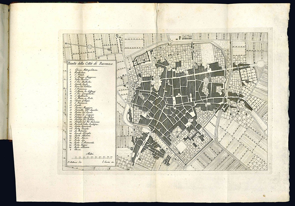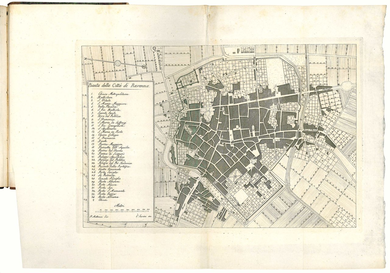 Interessante guida storico-architettonica di Ravenna corredata da alcune incisioni raffiguranti edifici della città e una pianta urbana ripiegata più volte.
