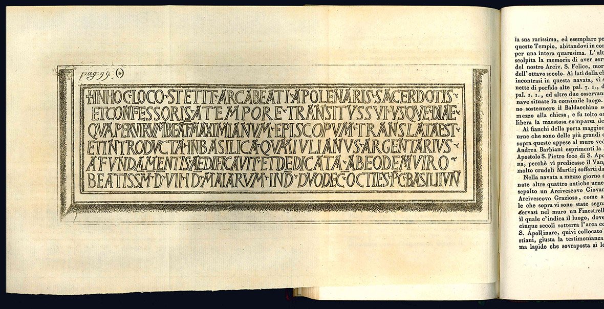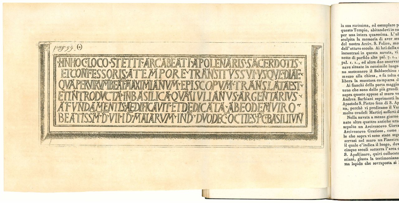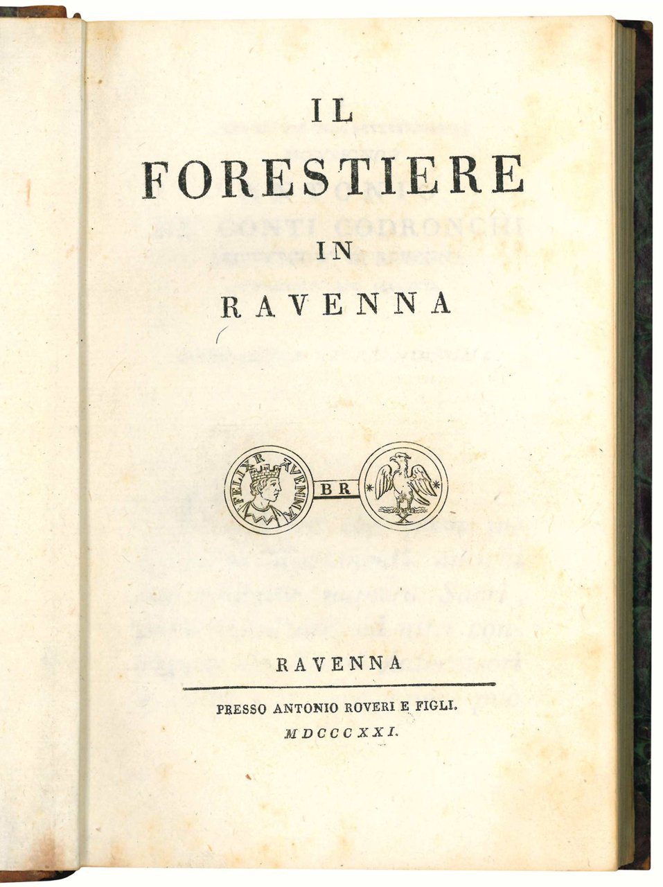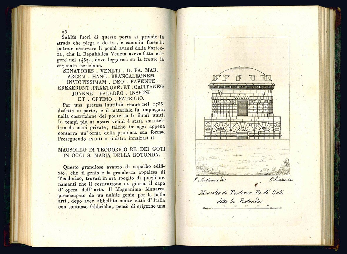 Interessante guida storico-architettonica di Ravenna corredata da alcune incisioni raffiguranti edifici della città e una pianta urbana ripiegata più volte.