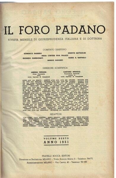 Il Foro Padano. Rivista mensile di giurisprudenza italiana e di dottrina. Volume sesto anno 1951