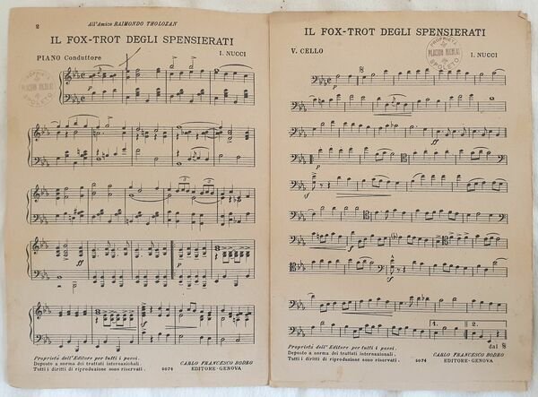 Partitura per orchestra degli anni '30 di una canzone.<BR>Copertina mancante. GENERE: Fox trot STRUMENTI: pianoforte, violino, violoncello, flauto, contrabbasso<BR>ANNO: anni '30 DIMENSIONI: In 8. cm 25,5x17,5 PAGINE: 7 CONDIZIONI: In buone condizioni. <BR>NOTE: Ex libris alla prima pagina. Beautiful score of one song, a complete score for orchestra of 1930's of one song. Cover is missing. MUSIC: Fox trot STRUMENTI: piano, violin; violoncello; flute, contrabbass<BR>YEAR: 1928 SIZE: In 8. 25,5x17,5 PAGES: pp. 7 CONDITIONS: In good conditions. NOTES: ex libris in the first page