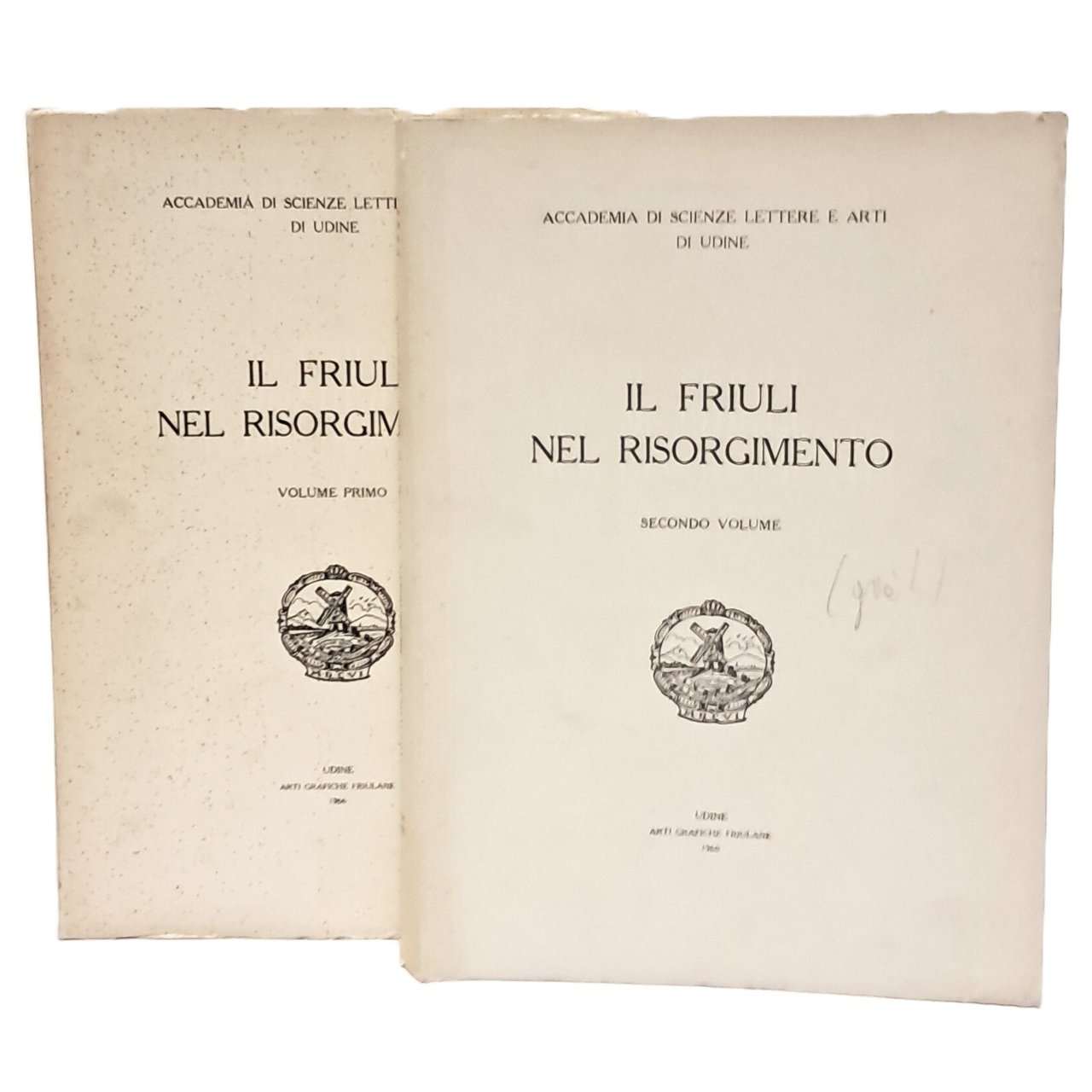 PRIMA EDIZIONE edita in occasione del centenario dell'unione del Friuli all'Italia in due volumi Pubblicazione che raccoglie un ciclo di letture accademiche effettuate tra il 64 e il 65; dall'indice del primo volume Gian Paolo Beinat, Il Risorgimento a S. Daniele del Friuli; Andrea Benedetti, Pordenone e i paesi del Friuli Occidentale nel Risorgimento; Antonio Faleschini, Il 1866 in Friuli cronache inedite e nel ricordo di contemporanei; Giovanni Maria Del Basso, Manoscritti risorgimentali della Biblioteca Comunale di Udine; Pier Vincenzo de Vito, Manoscritti inediti del Museo Risorgimentale di Udine. Il secondo volume contiene: Angelo de Benvenuti, Iconografia risorgimentale nel Friuli (1797-1866); Antonio Visentin, Le monete metalliche e le carte monetate ossidionali di Palmanova emesse durante l'assedio del 1813-14; Leo Pilosio, Il Friuli ed i friulani negli anni cruciali (1859-1966) - Note di cronaca. Brossura. Pp. 448+382. Ottime condizioni.