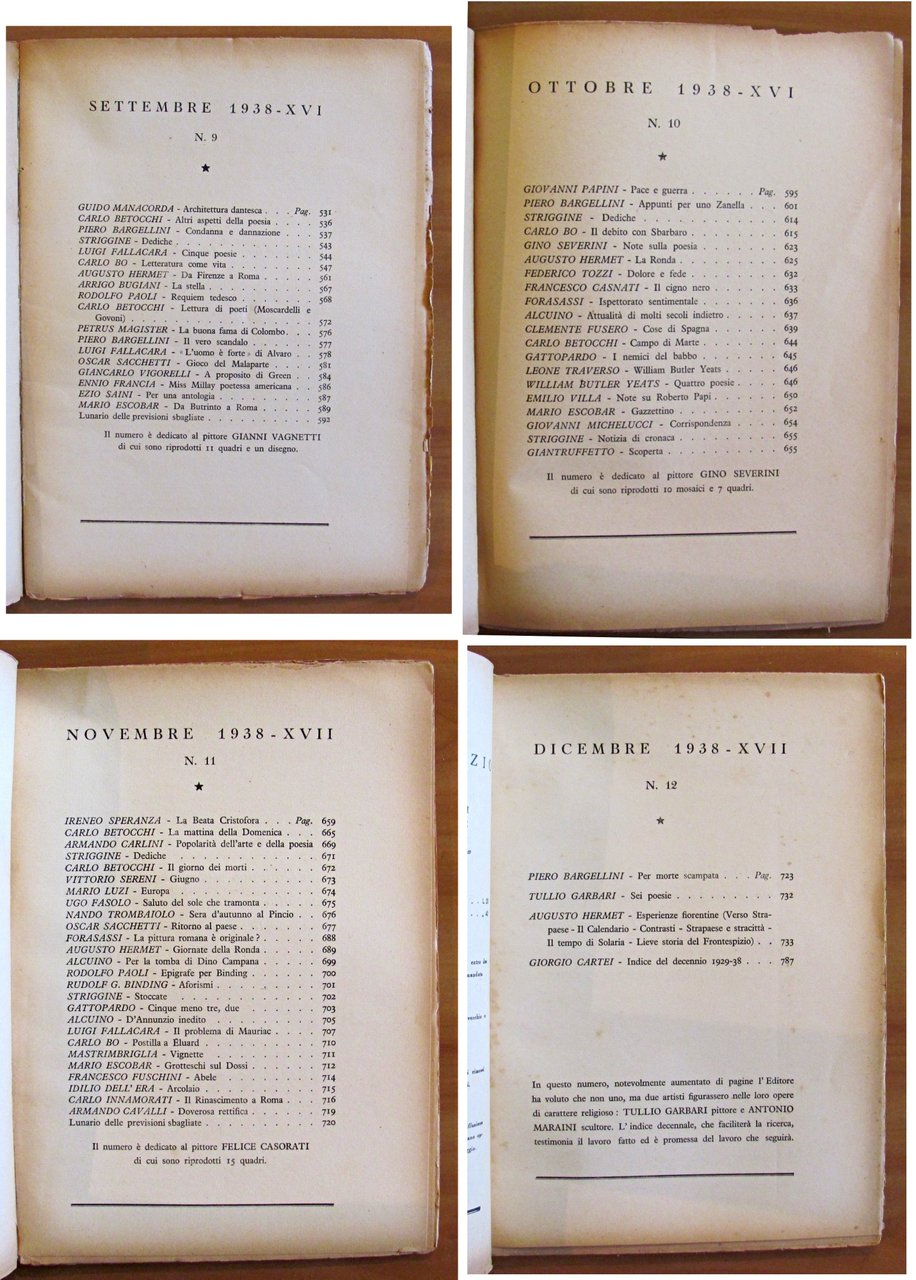 Anno XVI - N. 9-10-11-12. Settembre-Dicembre 1938. Molte illustrazioni in b/n n.t., anche a piena pagina, di vari artisti e illustratori. Ed. Vallecchi - Firenze, 1938. Brossure editoriali con lievi imperfezioni e mancanze ai dorsi. Alcune riviste sono parzialmente intonse. 20x27,5. BUONISSIMO STATO , Molto buono (Very Good)