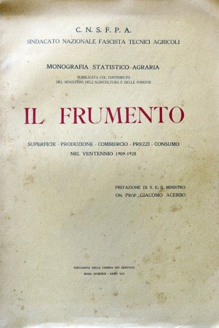Il Frumento. Superfice – Produzione - Commercio – Prezzi – Consumo nel ventennio 1909 – 1928. Monografia statistico - agraria pubblicata col contributo del Ministero dell'Agricoltura e delle Poste.
