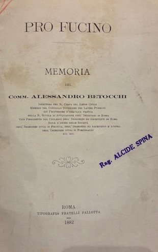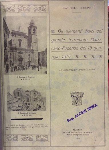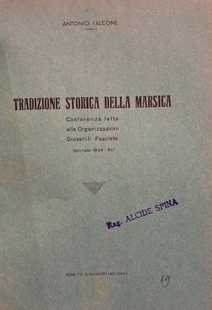 8vo (cm. 23,3), 16 pp. illustrate in bianco e nero (unito) Crema C., Sulla espansione glaciale quaternaria nella conca del Fucino, Roma, Tipografia della Pace E. Cuggiani 1920, da p. 141 a p. 143(1). Estratto dal Bollettino della Società Geologia Italiana (unito) Hassert K., Il presente e il passato del Lago di Fucino. Traduzione dal tedesco di L.F. De Magistris, Teramo, Tip. del Corriere Abruzzese 1898, 31(1) pp. con una tavola a doppia pagina n.t. (unito) Grossi Eliseo, Una Madonna carbonara. Estratto da ‘L’Abruzzo radicale’, Aquila, Prem. Tip. B. Vecchioni & Figli 1907, 16 pp. (unito) Oddone Emilio, Gli elementi fisici del grande terremoto Marsicano-Fucense del 13 Gennaio 1915. Estratto dal Bollettino della Società Sismologica Italiana, Modena, Società Tipografica Modenese 1915, 149(1) pp. con num.se illustrazioni n.t. (unito) Costantini Beniamino, I terremoti d’Abruzzo (in ‘Rivista Abruzzese di scienze, lettere ed arti’), Teramo, Rivista Abruzzese 1915, da p. 281 a p. 324 (unito) Falcone Antonio, Tradizione storica della Marsica. Conferenza letta alle Organizzazioni giovanili fasciste, Avezzano, Stab. Tip. D. Putaturo 1934, 21(1) pp. (unito) Rivera Cesare, I Conti de’ Marsi e la loro discendenza fino alla fondazione dell’Aquila (843-1250). Cronistoria medioevale dell’Abruzzo e della Sabina di Rieri (5 Dispense, tutto il pubblicato), Teramo, Giovanni Fabbri Editore 1913-1915, 240 pp. Con alcune ill.ni n.t. e una tabella più volte ripiegata f.t. (unito) Betocchi Alessandro, Pro Fucino. Memoria., Roma, Tipografia Fratelli Pallotta 1882, 30 pp. Legatura ‘900 in mz. tela. Titolo ‘Marsica vol. 2 in nero su tassello rosso al ds. ed etichetta cartacea con specifica dei titoli contenuti nel volume. Indice della Raccolta dattiloscritto su una carta inserita ad inizio volume. Brossure editoriali conservate all’interno. Provenienza: Collezione Spina, Avezzano (timbretti ex libris).