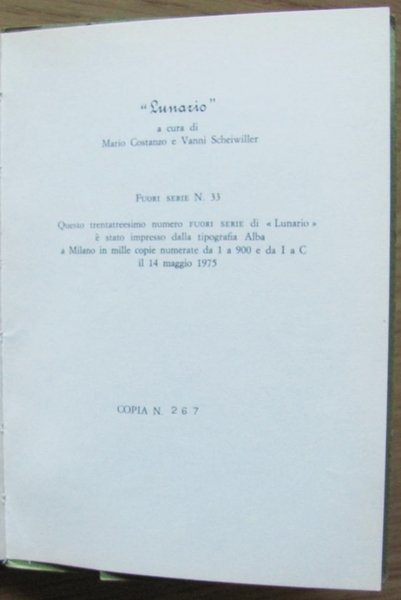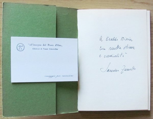 Prefazione di André Pieyre Mandiargues. Edizione Fuori Serie "Lunario" N.33. Una incisione in antiporta di Tono Zancanaro. All'Insegna del Pesce d'oro - Editore Vanni Scheiwiller - Milano, I edizione 1975. Brossura editoriale con ali. Edizione in tiratura numerata di 900 esemplari, nostro N.267. 12,5x17,5; pp.89. Copia "Omaggio per recensione" da biglietto da visita della Casa Editrice allegato, con dedica autografa del'autore. Ottimo stato. , Ottimo (Fine)