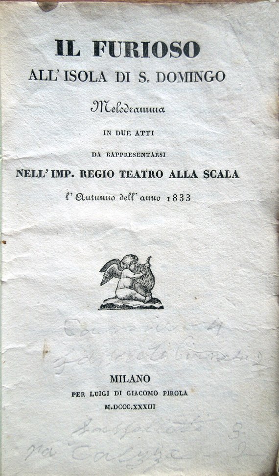 Il furioso all'isola di S. Domingo. Melodramma in due atti da rappresentarsi nell'Imp. Regio Teatro alla Scala l'Autunno dell'anno 1833