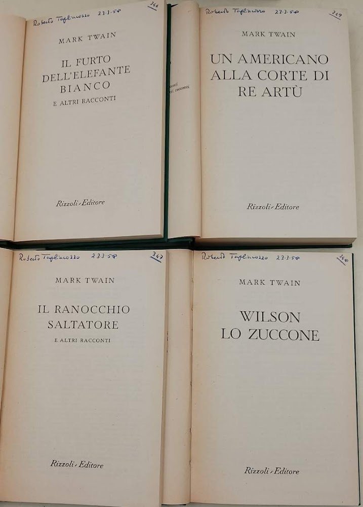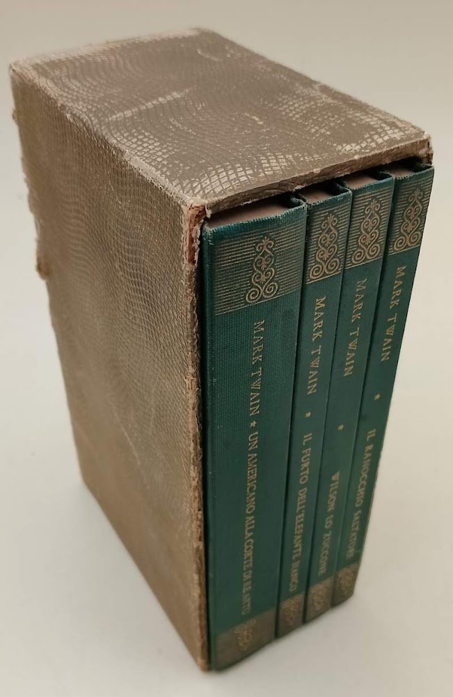 4 voll. in 16', leg. ed. con tit. in oro al dorso, astuccio muto: -Wilson lo zuccone, 1949, pp. 164 -Il ranocchio saltatore e altri racconti, 1950, pp. 149 -il furto dell'elefante bianco e altri racconti, 1952, pp. 156 -Un americano alla corte di Re Artu', 1955, pp. 367 Segni d'uso all'astuccio, volumi in buono stato, ordinari segni del tempo. ***Due to bureaucratic reasons, books dated over 70 years old cannot be immediately exported, please contact us before placing the order.***
